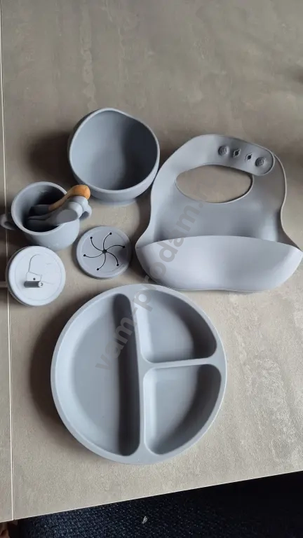 пользовались раза 3. не зашло. лежит без дела. в наборе: порционная тарелка, супница, 2 ложки, 2 вилки, грызунок, нагрудник, кружка с 2умя крышками (одна для снеков, вторая с трубочкой).