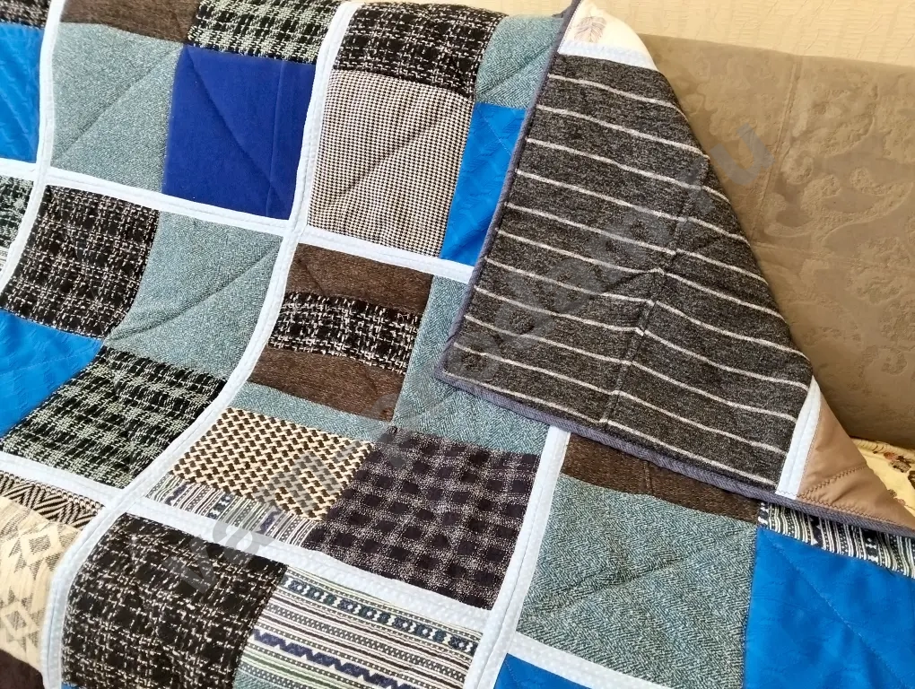 Одеяло сшито из тёплого лоскута в стиле пэчворк.