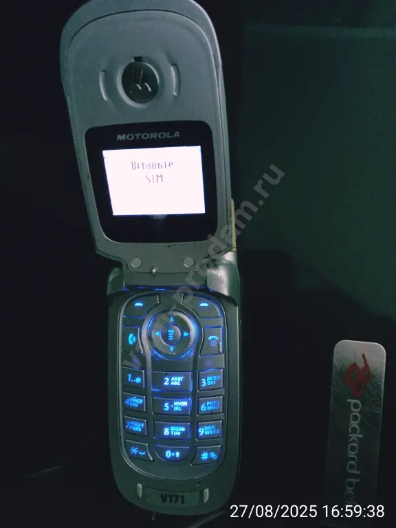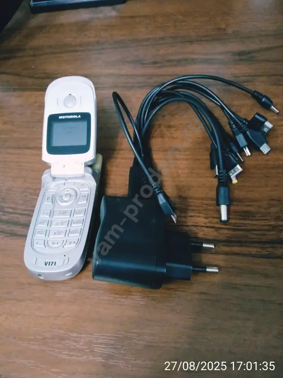 Сотовый телефонOTOROLA V-171 (Раскладушка).Б/У. Новый аккумулятор.Провод зарядки с 10-ю разными штекерами.Можно заряжать телефоны с разными шиекерами.