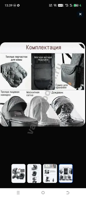 В комплекте идут перчатки тëплые, москитная сетка, дождевик, сумка для мамы, мягкая ватная подушка, тëплая накидка на коляску.
