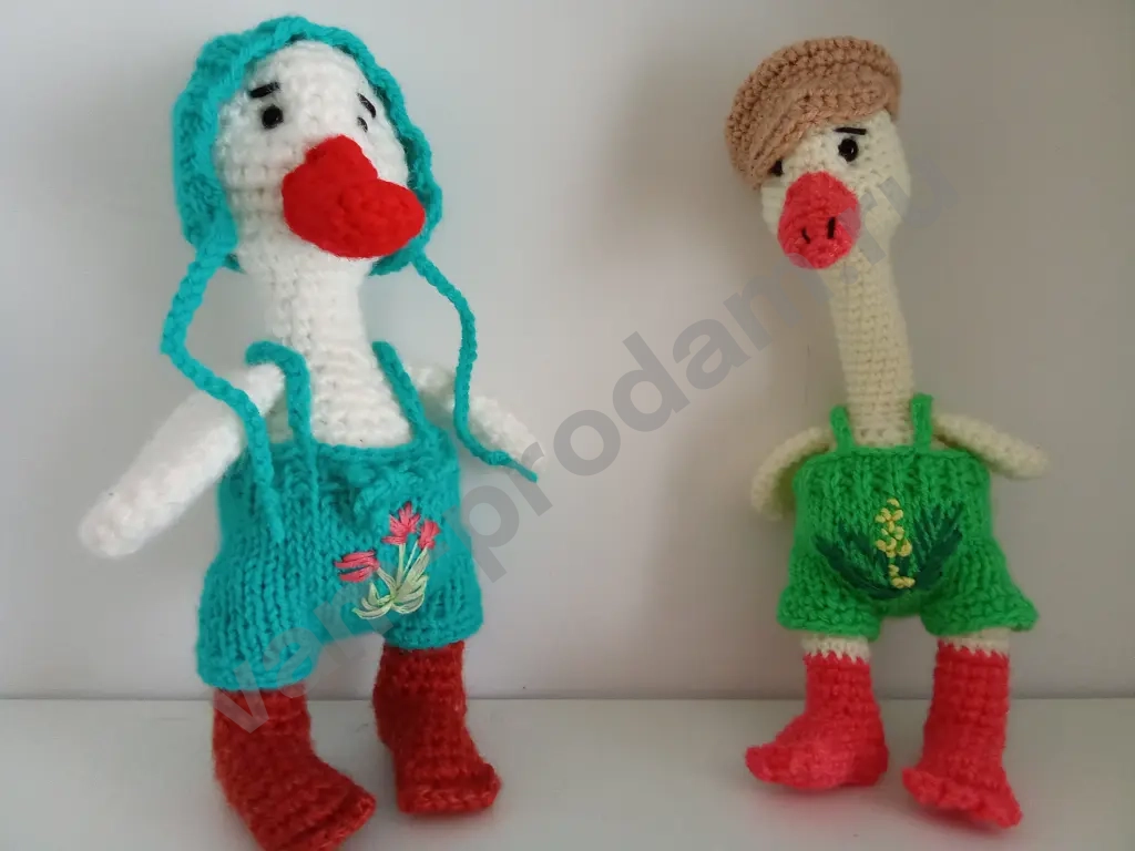 Игрушки вязаные крючком. Пряжа детская пихорка. Наполнитель синтепон, глазки пластиковые. Одежда на гусях съёмная. Вышивка выполнена из нитей мулине