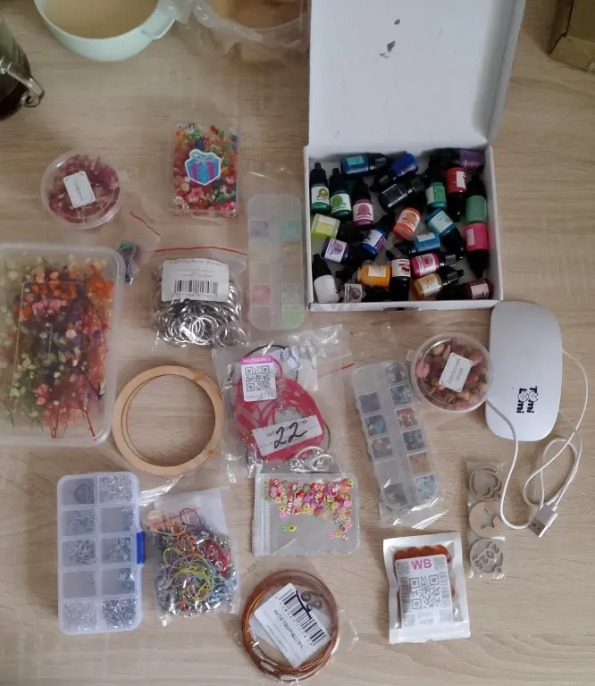 все для изделий из эпоксидной смолы. молды, фурнитура, сухоцветы разные 4 вида, наполнения, краски. уф-лампа. отвертка со свёрлами для установки фурнитуры. смолы нет.
