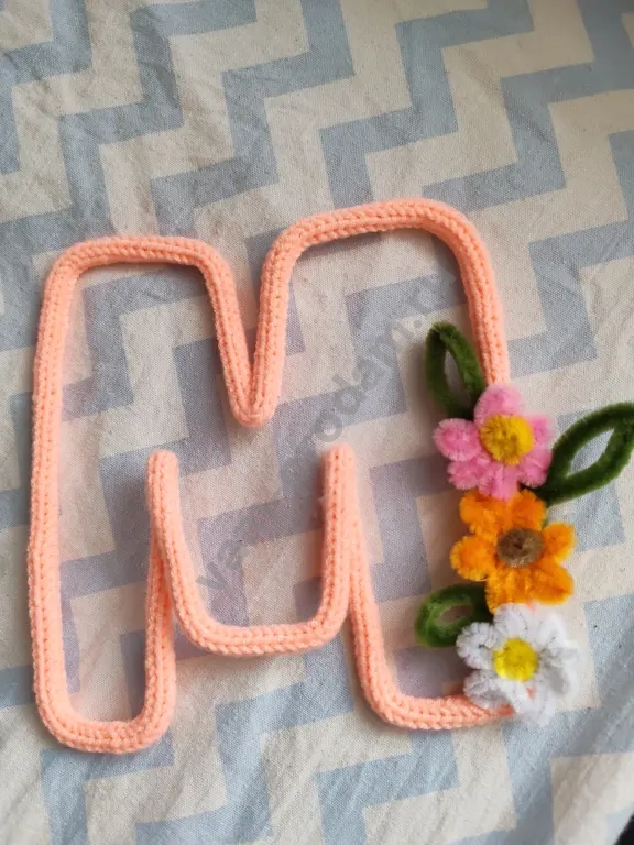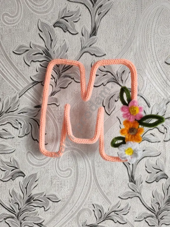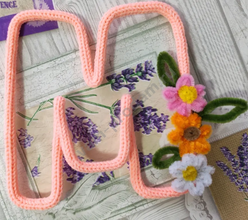 Представляю вязаную букву «М», выполненную в технике трикотин. Нежный персиковый цвет и очаровательные цветочные акценты превратят любой интерьер в уютное пространство!