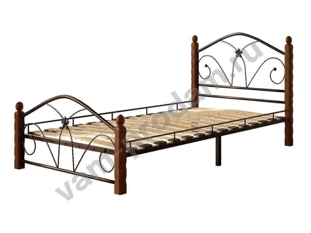 Опоры резные по углам кровати изготовлены из массива березы покрытые специальным, цветным лаком (Шоколад, махагон или белый).