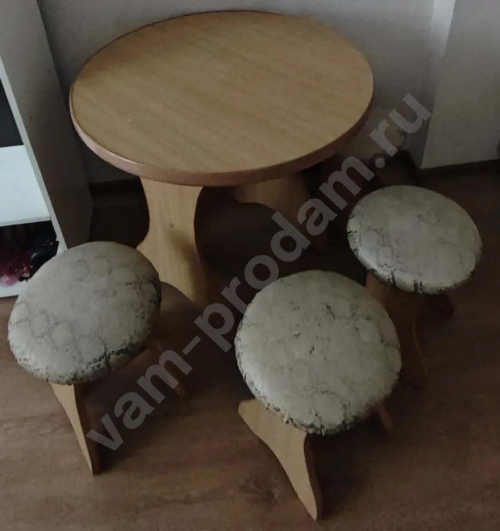 Продаётся круглый кухонный стол из светло-коричневого дерева. Диаметр столешницы составляет 73 см. Этот прочный и устойчивый стол станет отличным дополнением к вашему интерьеру. Стол выполнен полностью из дерева, что обеспечивает его долговечность и устойчивость. Несмотря на то, что он был в использовании, состояние хорошее, без видимых повреждений. Бонусом отдам бесплатно четыре табуретки.