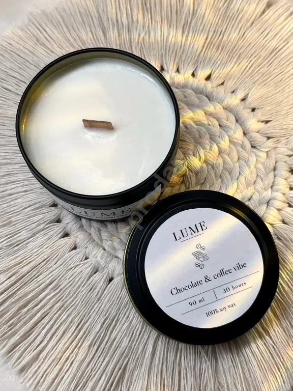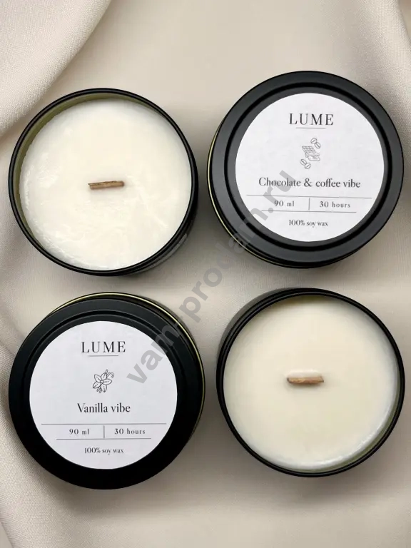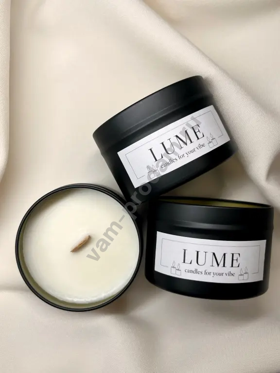 Контейнерные ароматические свечи ручной работы из натурального соевого воска с деревянным фитилем в железной баночке на 90 мл.