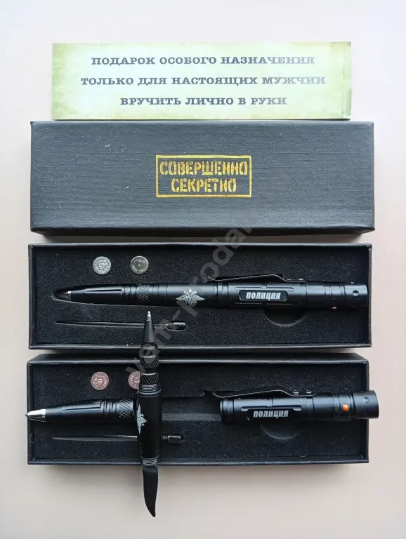 Ручка тактическая в комплекте: ударник, ручка, фонарик, нож, запасной стержень, батарейки. В наличии различная символика: Полиция, Погранвойска, Штурмовик, Морпех, Россия.