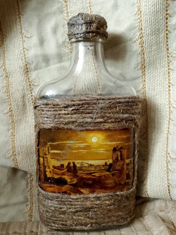 бутылка 0,5,роспись масло,декор пеньковая бечева,покрытие лак,снаружи не мыть,протирать влажной салфеткой или мягкой щёткой