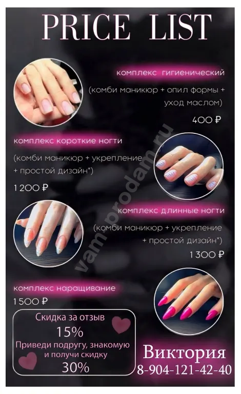 Тип услуг: Аппаратный маникюр, Детский маникюр, Дизайн ногтей, Классический маникюр, Комбинированный маникюр, Коррекция наращённых ногтей, Маникюр с покрытием гель-лаком, Маникюр с покрытием лаком, Мужской маникюр, Наращивание ногтей, Ремонт ногтя, Снятие гель-лака с ногтей на руках, Снятие наращённых ногтей