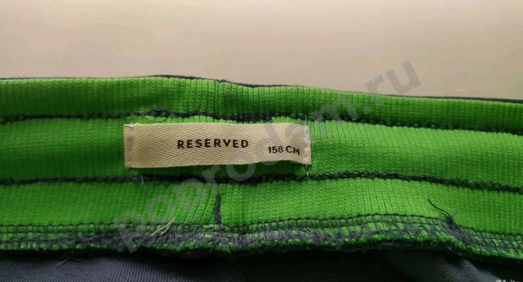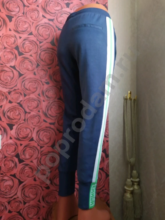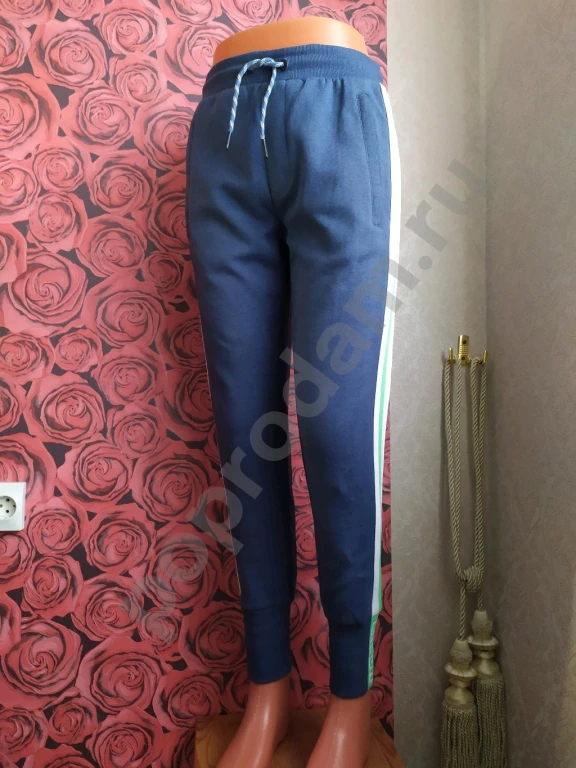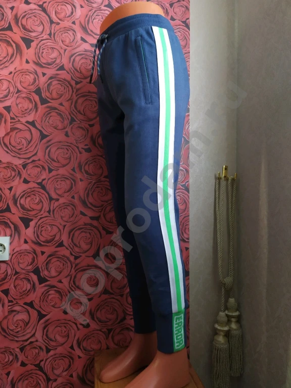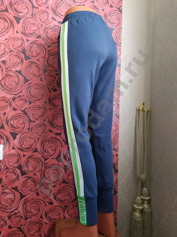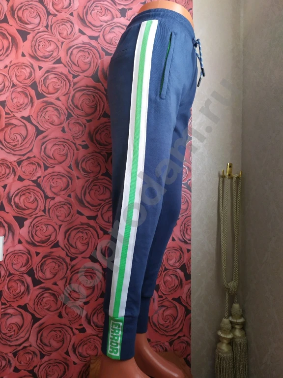 Цвет темно-синий с яркими бело-зелеными лампасами на штанинах.