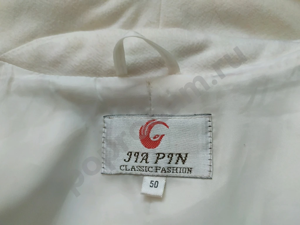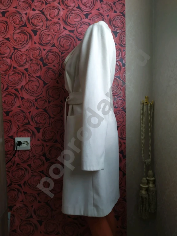 Пальто женское демисезонное белого цвета с потайными пуговицами и с поясом.