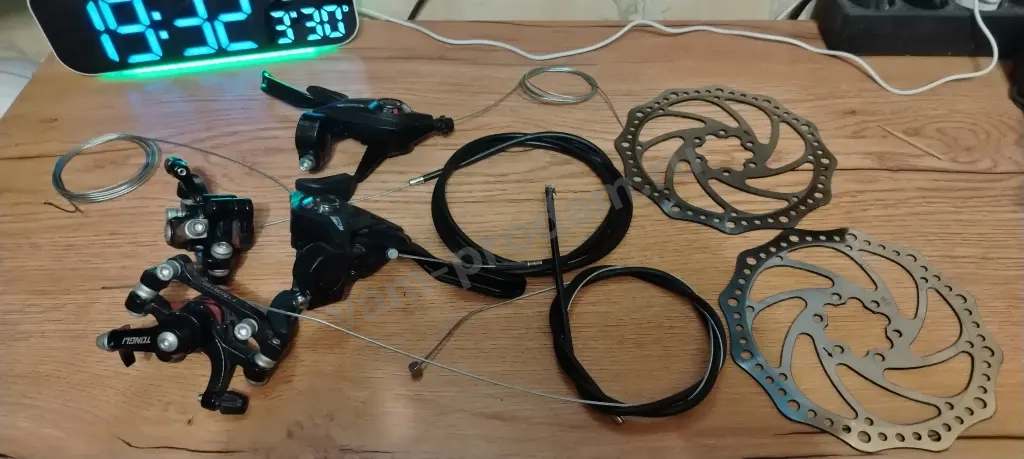 Полный комплект механических тормозов. В нормальном состоянии, использовались в течении месяца.Продаю так как заменил на гидравлику.