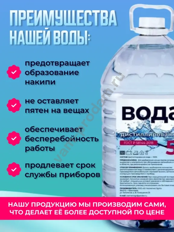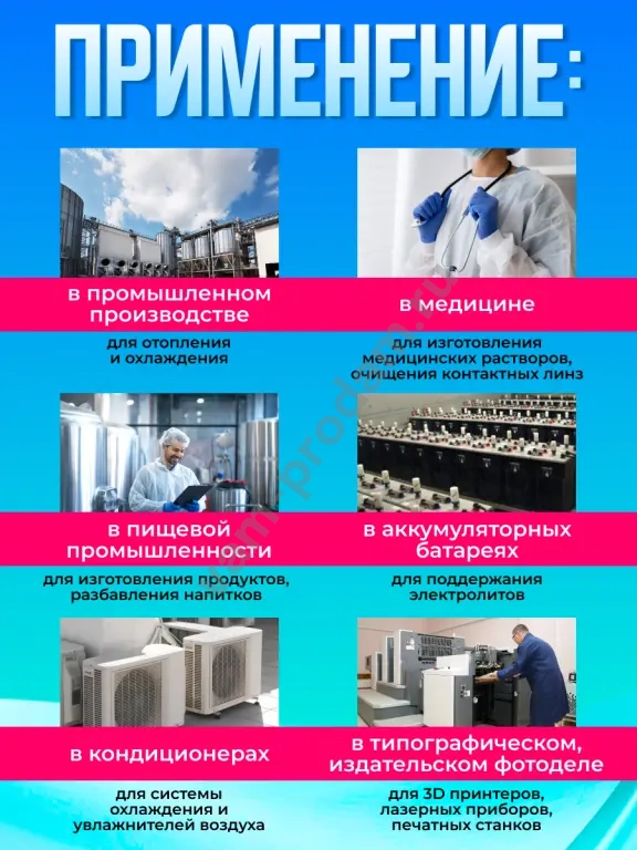 Дистиллированная вода — это очищенная вода, практически не содержащая примесей и посторонних включений. Она проходит многоступенчатую систему фильтрации, в результате чего из неё удаляются минеральные и органические соли, металлы и другие соединения. для бытовых приборов ,систем отопления лаборатории и медицинского назначения.