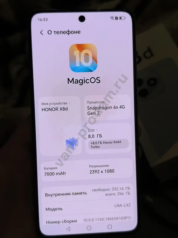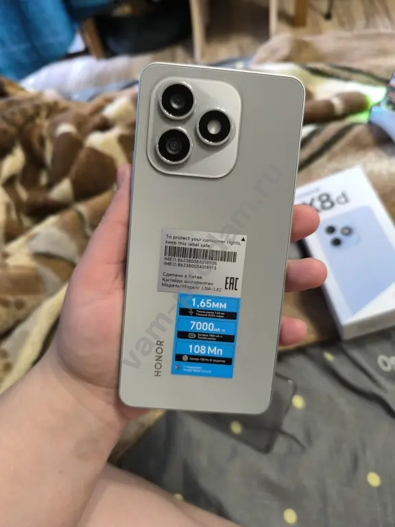 Продаю новый смартфон Honor X8d с 256 ГБ встроенной памяти и 8 ГБ оперативной памяти. Телефон в сером цвете, выглядит стильно и современно. На экране установлена последняя версия MagicOS. Устройство не использовалось, коробка вскрыта, но все комплектующие — блок и провод зарядки сохранены. На задней панели видна информация о модели и технических характеристиках. Блок зарядки и провод даже не вскрывались, коробка вкрывалась для того чтобы осмотреть телефон на брак. Возможен небольшой торг