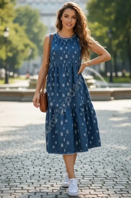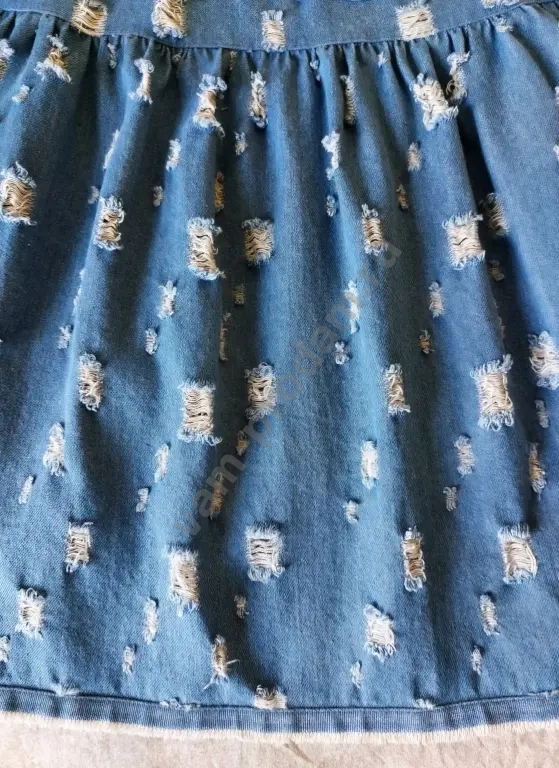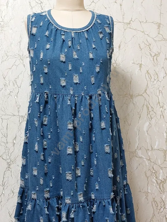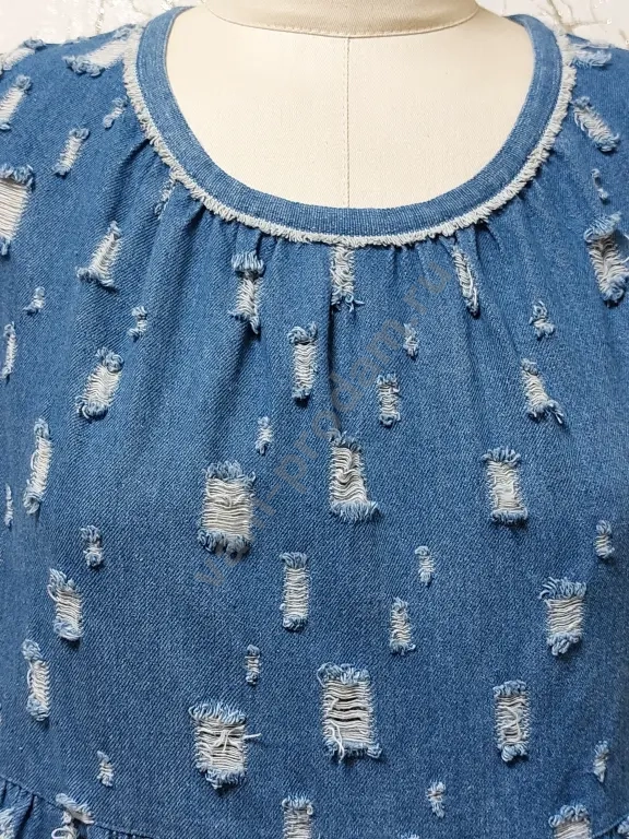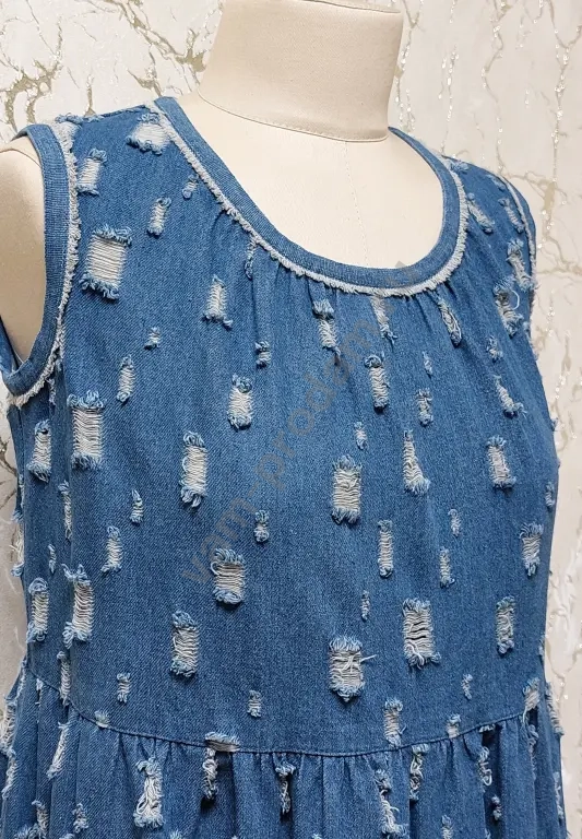 Джинсовый сарафан в оригинальном стиле, свободного силуэта, с завышенной линией талии и ярусной юбкой. По горловине сборка. Низ юбки, горловина и проймы обработаны кантом с небольшой бахромой. Длина по спинке 116 см. Размер 48. Новый.