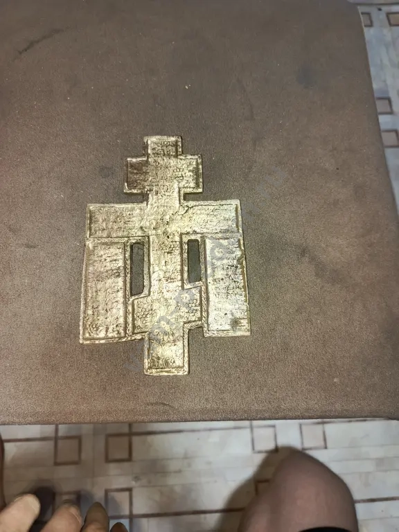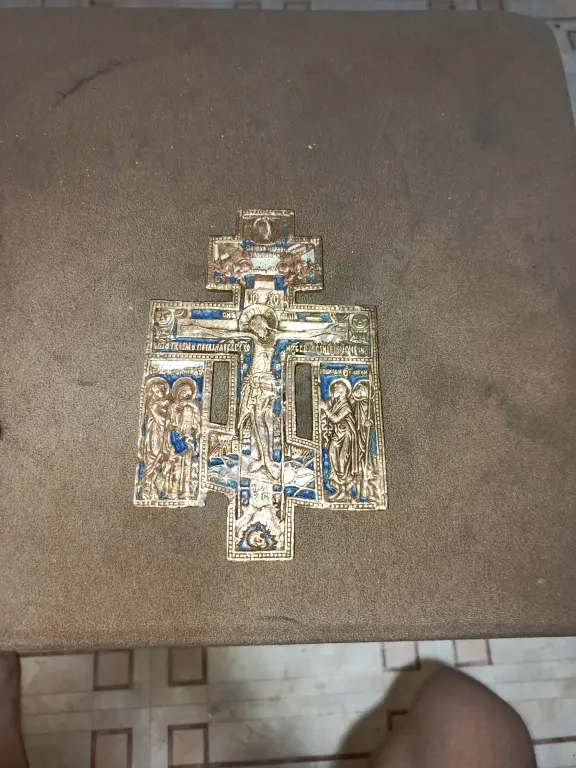 Крест киотный "Распятие Христово с предстоящими", бронза с синей белой эмалью, Российская Империя, 1850-1890 гг.