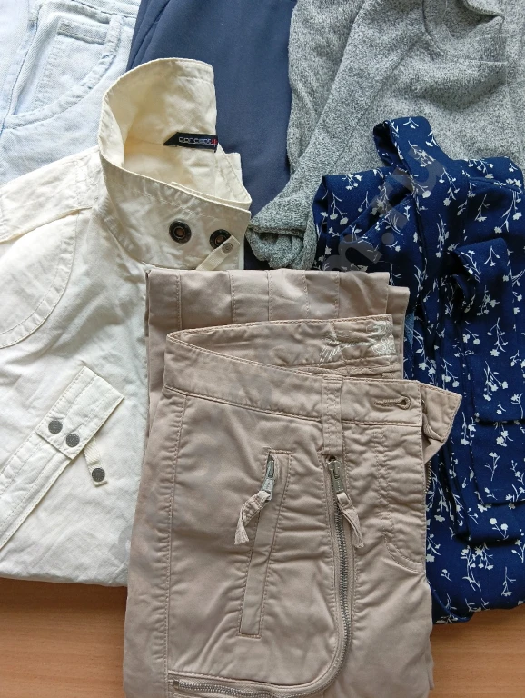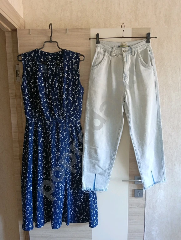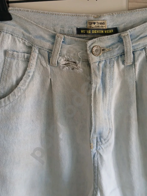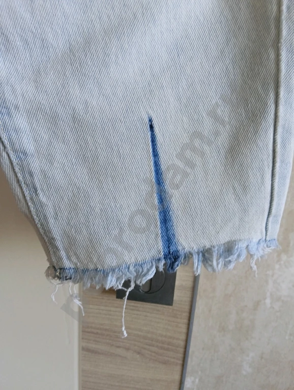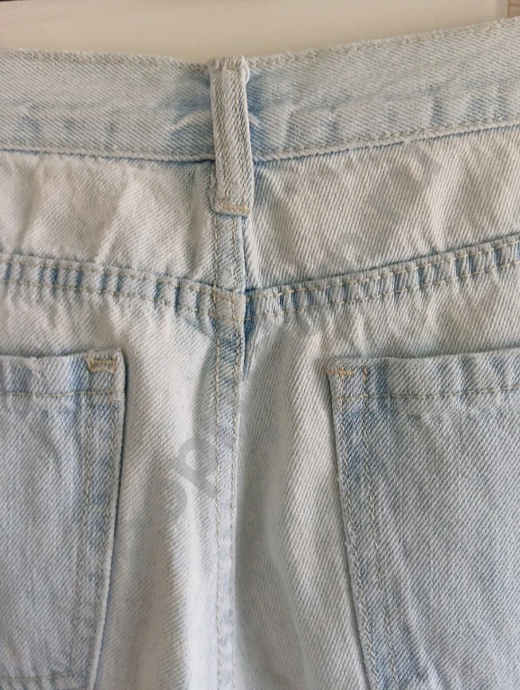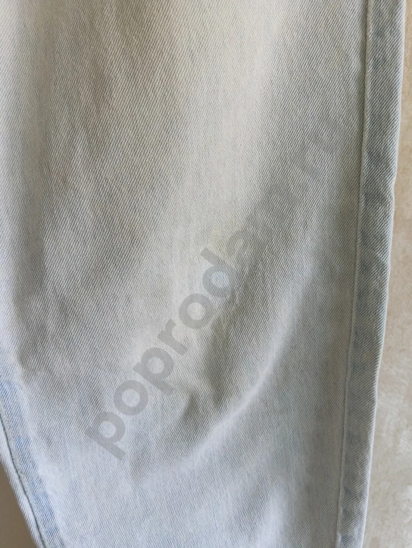 потертости, рвань у пояса, низ не подшит, пятно на левой гаче.