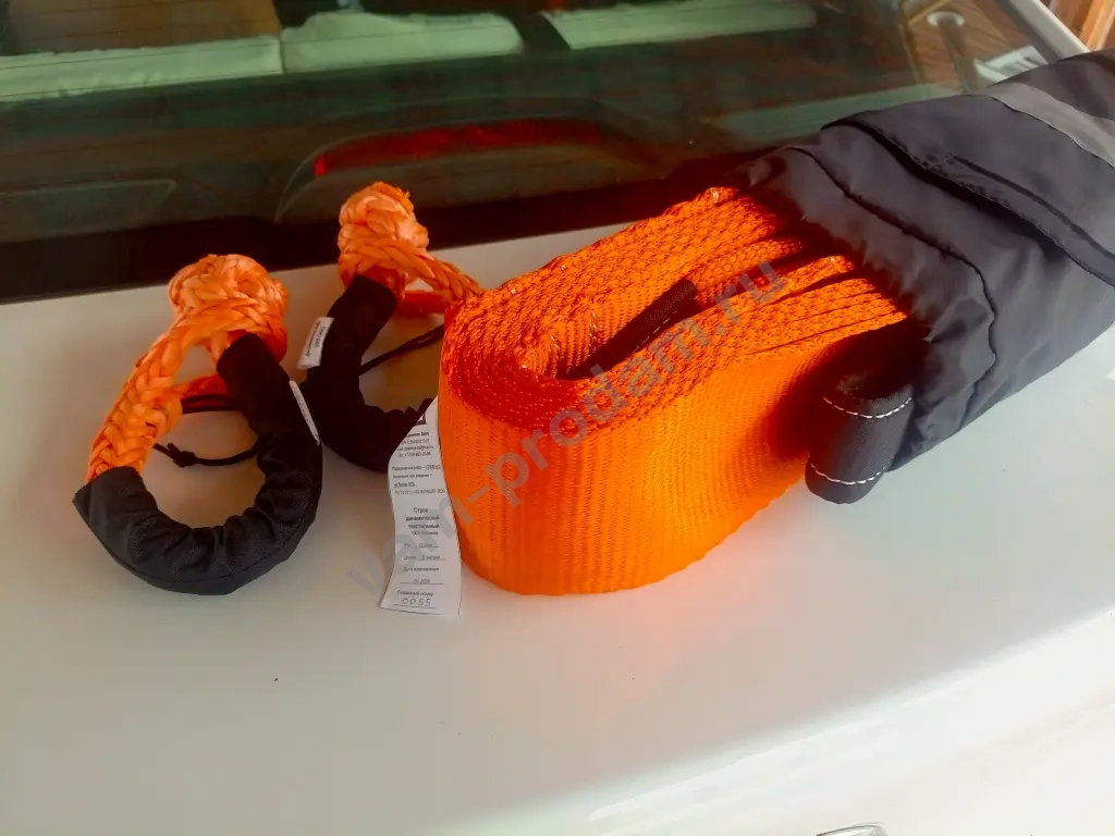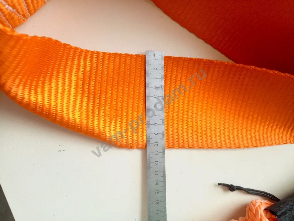Динамический трос разрывная нагрузка 12 тонн, длина 6 метров. Изготовлен из полиамидной ленты российского производства шириной 10см, толщиной 3,9 мм, растяжимость до 30%. Цвет оранжевый