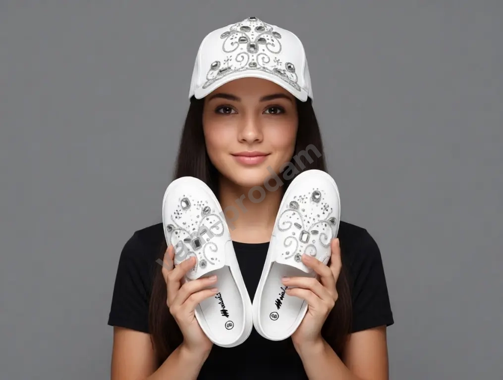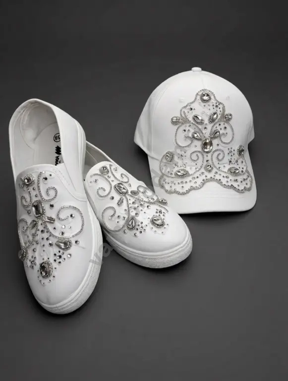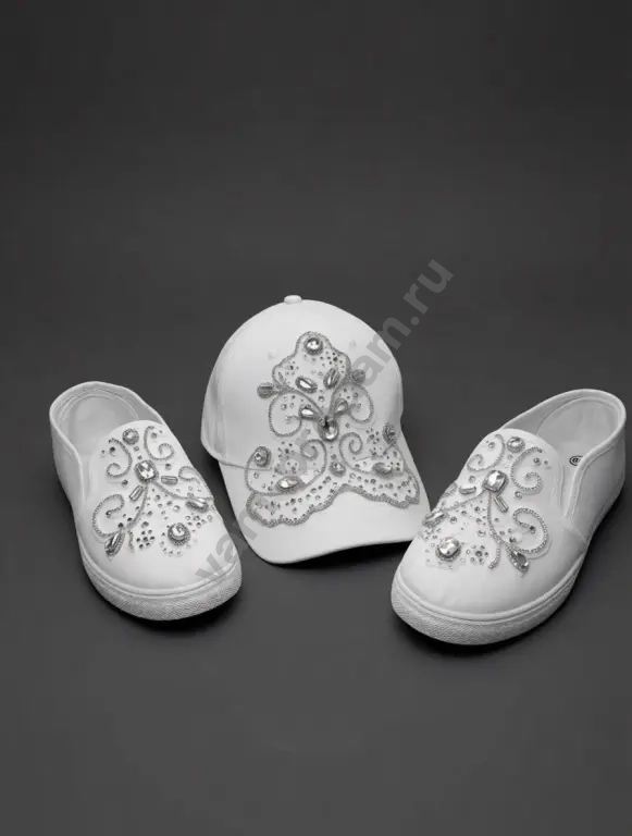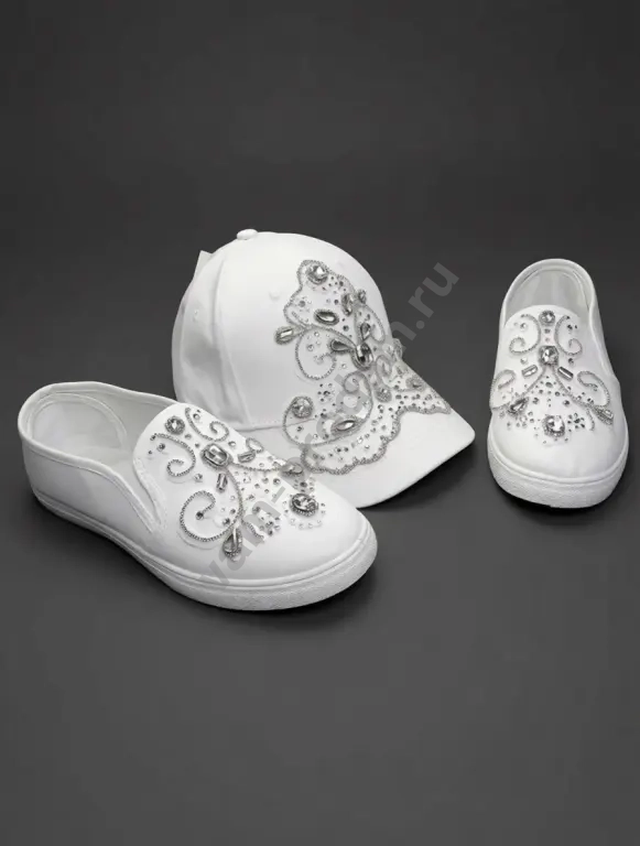 Комплект из бейсболки и слипонов. Отделаны кружевом и инкрустированы стеклянными стразами.