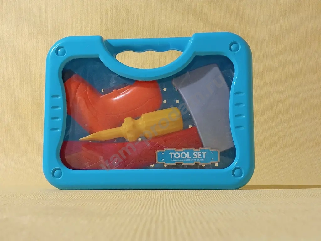 Набор инструментов, пластиковые инструменты, внутри пила, отвёртка, разводной ключ, топор, шуруповёрт (имитация). Состояние инструментов хорошее, сама коробка крепкая, но плёнка выпадает и с царапинками, её можно заменить.