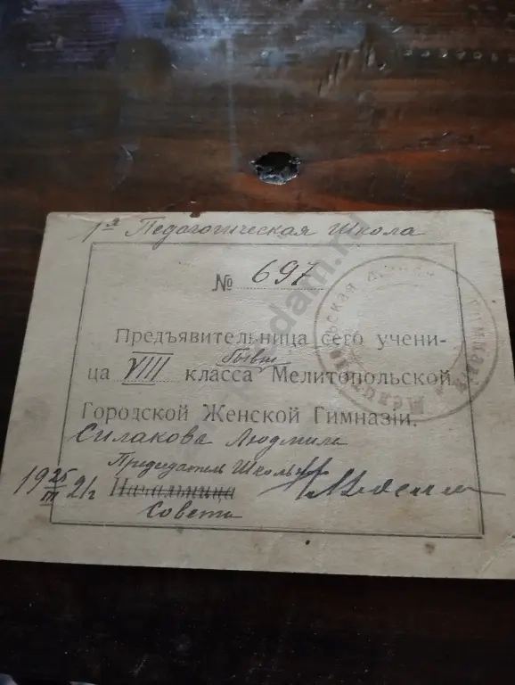 удостоверение ученицы женской гимназии г Мелитополь 1921 г