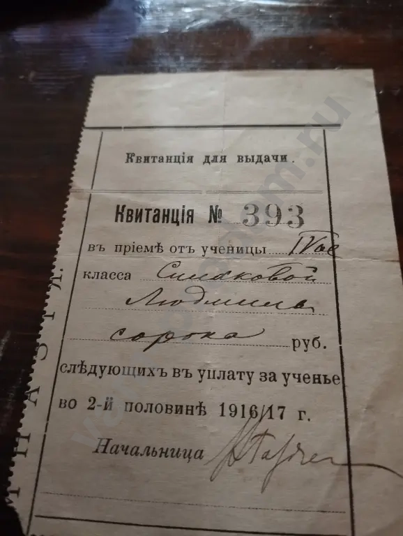 квитанция для выдачи об оплате за ученье 1916/17 г. г Мелитополь