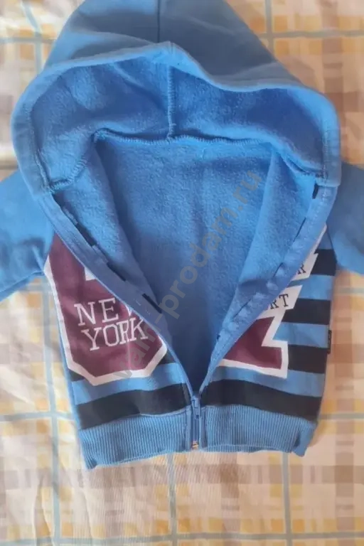 Продается синяя кофта для малышей, размер 86 см (18 месяцев). В хорошем состоянии. Дизайн с яркими полосками и надписью "New York" на груди. Подходит для прохладной погоды.