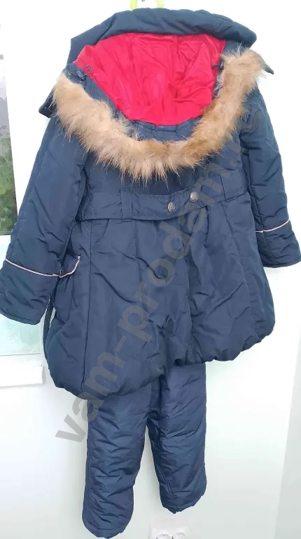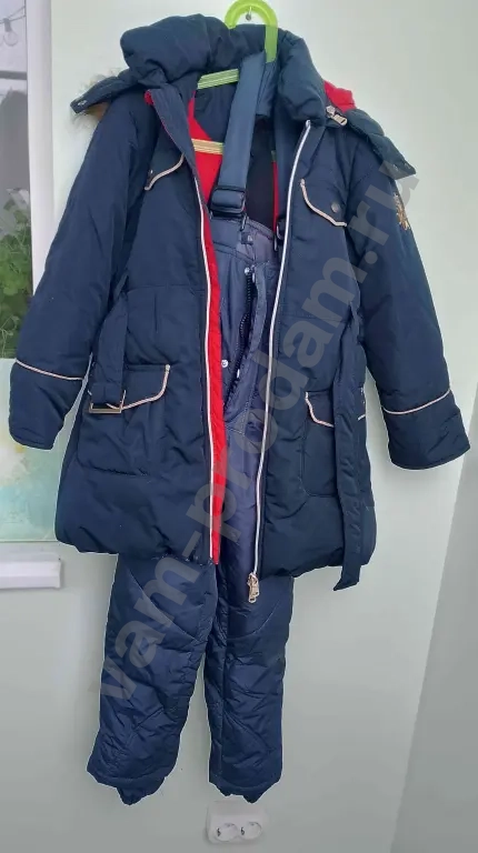 Костюм зимний утеплённый, куртка удлинённая (пальто парка аляска) и штаны-комбинезон на лямках. Марка Faberlic. Ткань плащовка, цвет темно-синий, на 122 см. В отличном состоянии, надевался несколько раз.