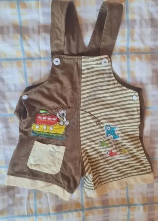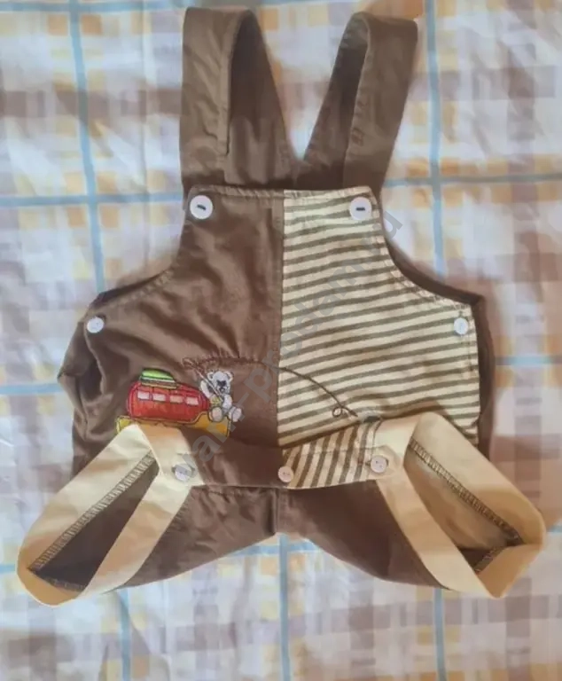 Штаны на лямках для малышей, размер 56-62 см (2-3 месяца). Изготовлены из мягкого хлопка, что обеспечивает комфорт и легкость в уходе. Коричневый цвет с рисунком добавляет оригинальности. Подходят для прогулок и повседневной носки.