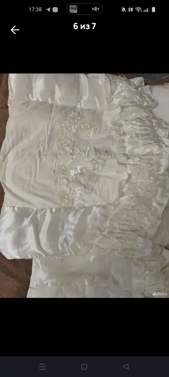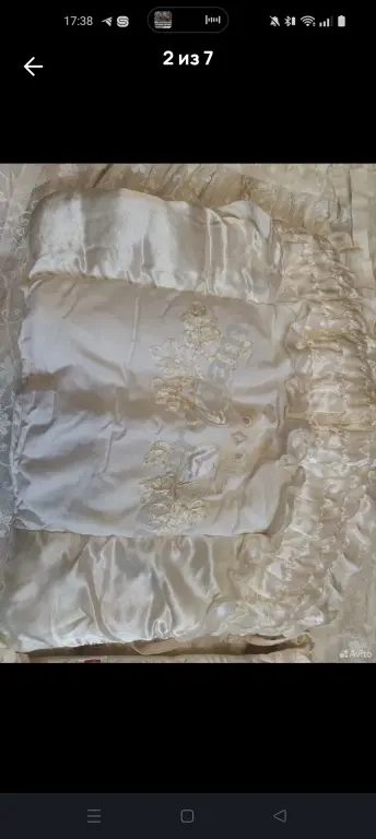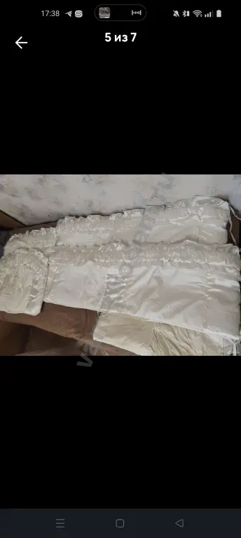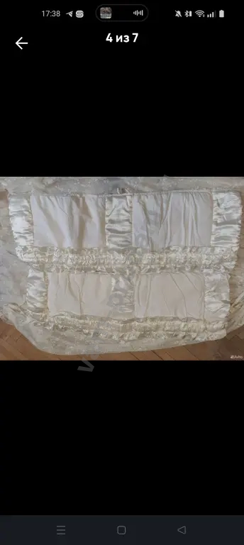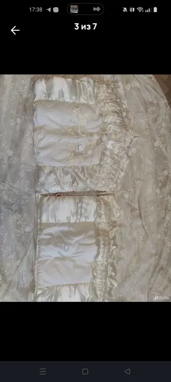Бортики в детскую кроватку бу. В отличном состоянии. Нежно кремового цвета. Красивый, огромный балдахин. Всего 6 предметов. Изголовье 60х50, параллельная подушечка к изголовью 60х45, боковые 120х45. Наматрасник 115х64 без свисающих элементов (оборки). Оборки наматрасника 30 см. Балдахин ширина по низу 6 м 20 см.