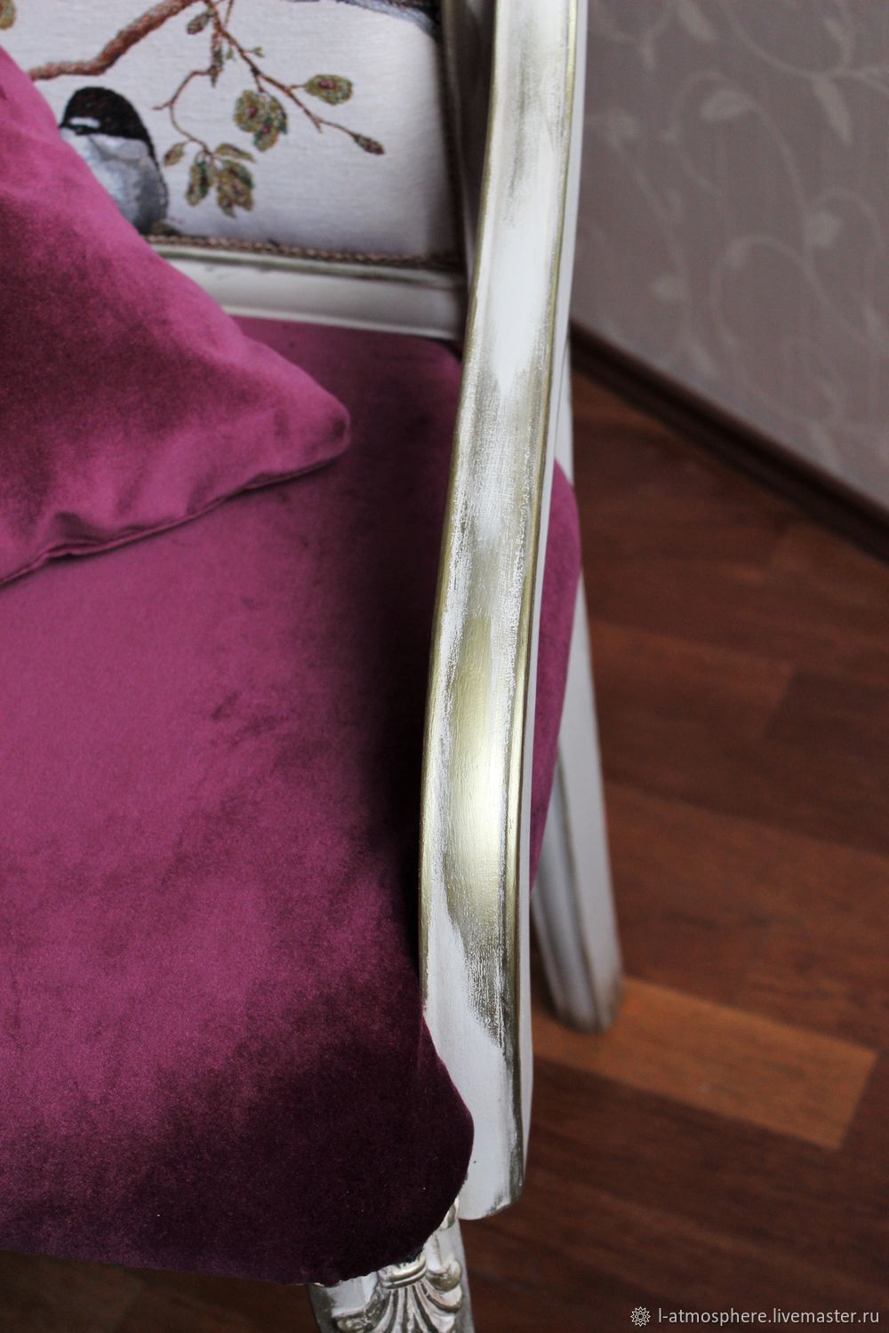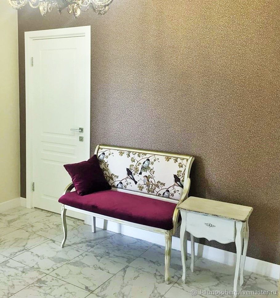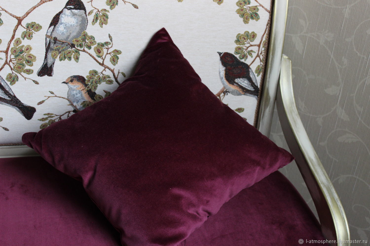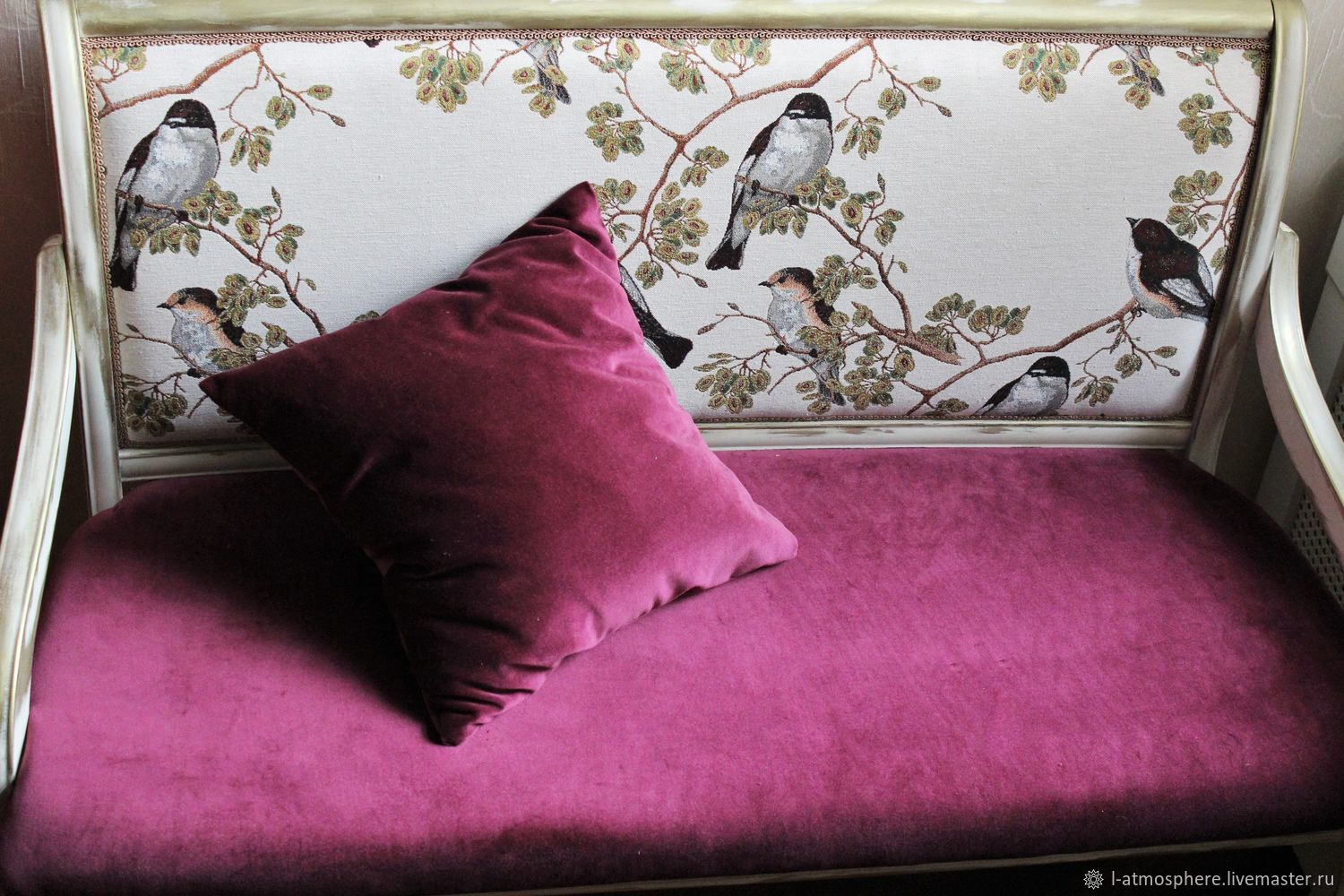 Роскошный диванчик Bordeaux из массива бука. Обивка хлопковым бархатом глубокого винного оттенка. На спинке редкий белый гобелен с птицами.