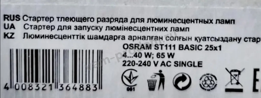 Стартер для люминесцентных ламп. OSRAM ST 111 4-65W.220-240V.25штук