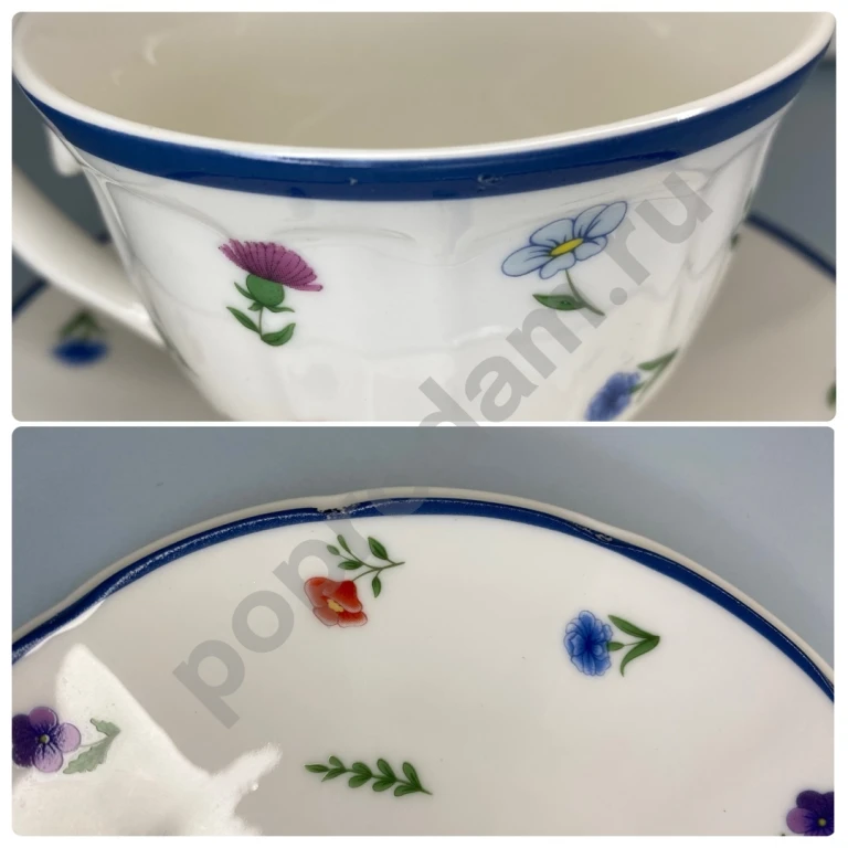 🌸Чайная пара или кофейная пара из фарфора белого цвета с полевыми цветочками и синей каймой