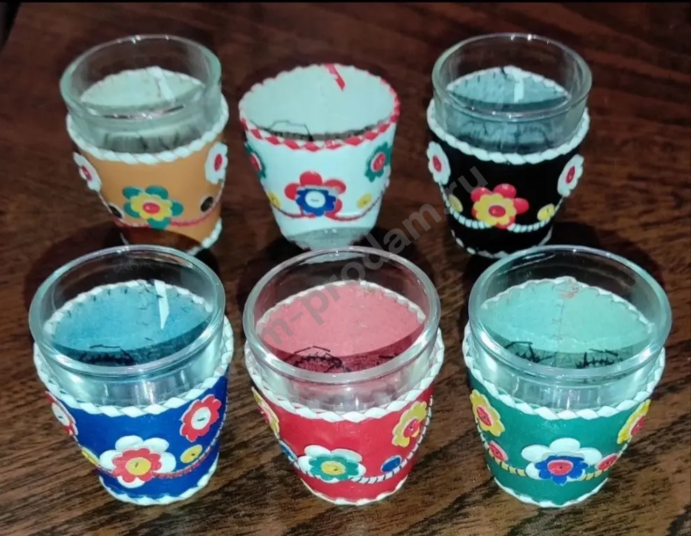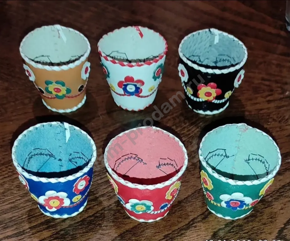 Красивый набор, 6 - маленьких стопок в кожаных искусно расшитых разноцветных чехлах, к сожалению одна стопка утеряна, а чехол остался. Всё в отличном состоянии. Видел такие, но без чехлов в продаже на Авито, можно докупить для комплекта.