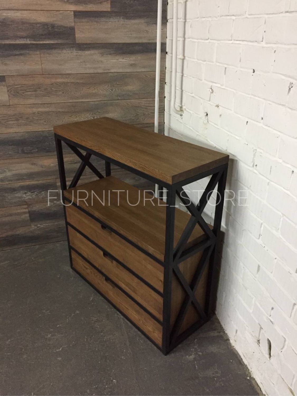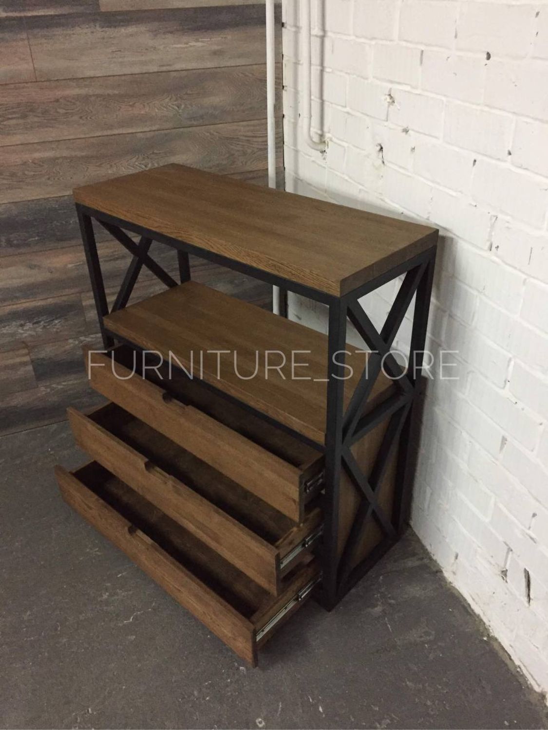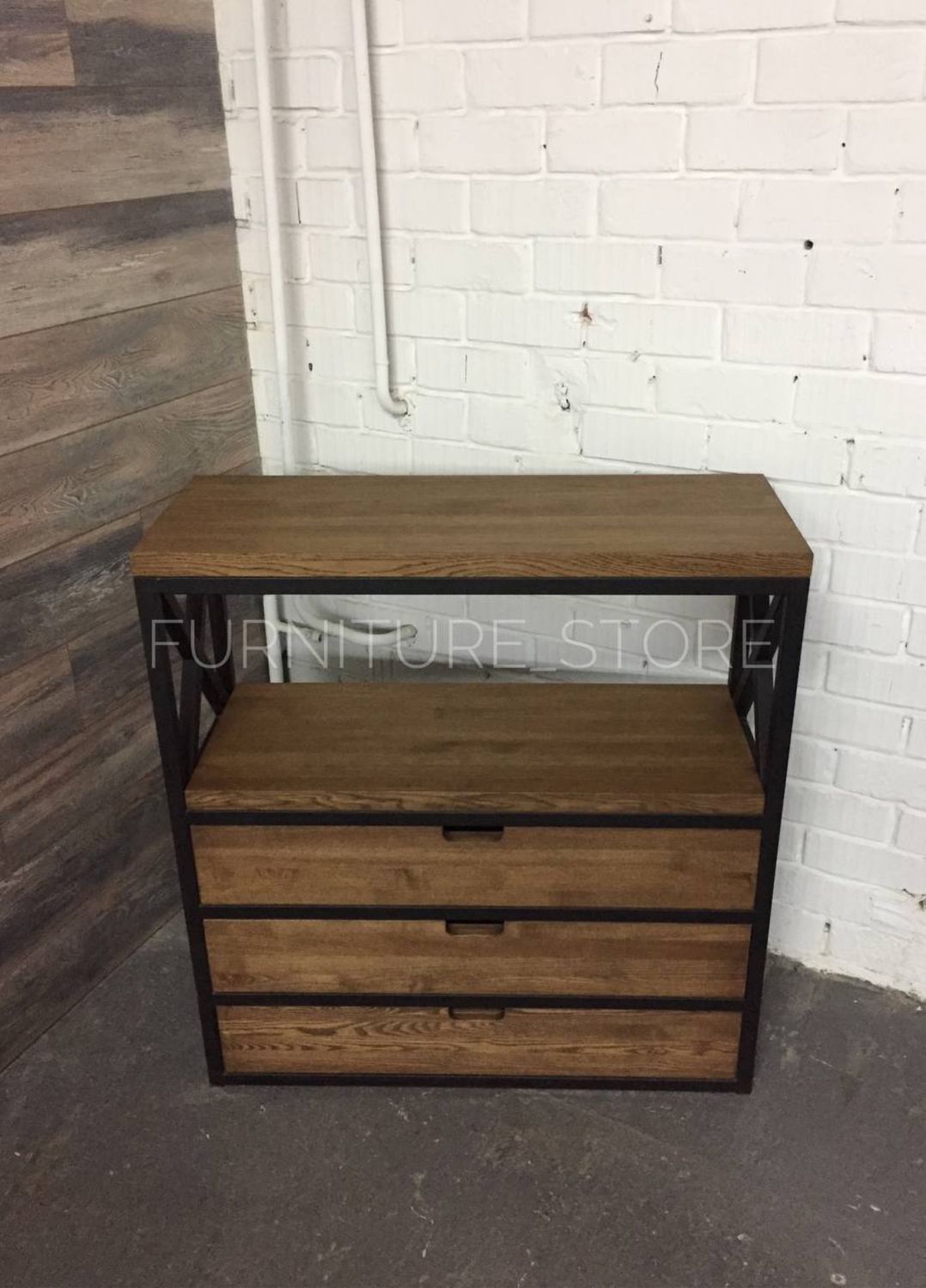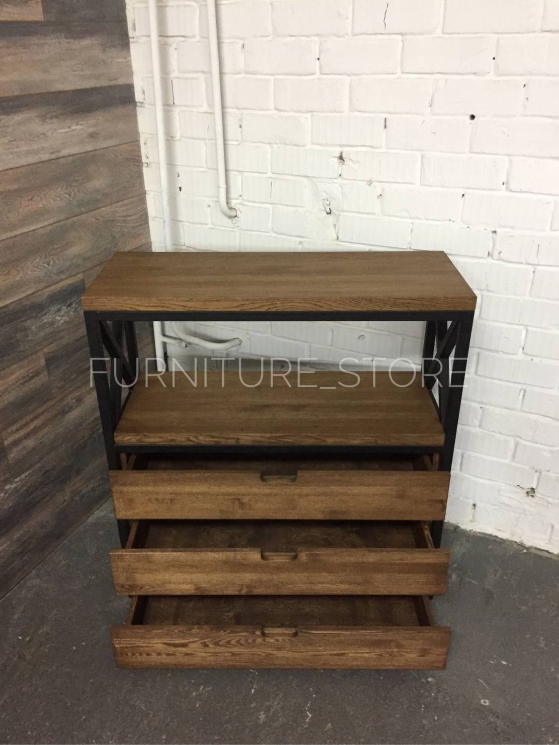 Комод в стиле лофт с тремя большими выдвижными ящиками и открытой полкой изготовлен из массива ясеня и металлического профиля. Ясень покрыт тонирующим маслом по дереву. Металлический профиль покрыт порошковой краской по металлу.