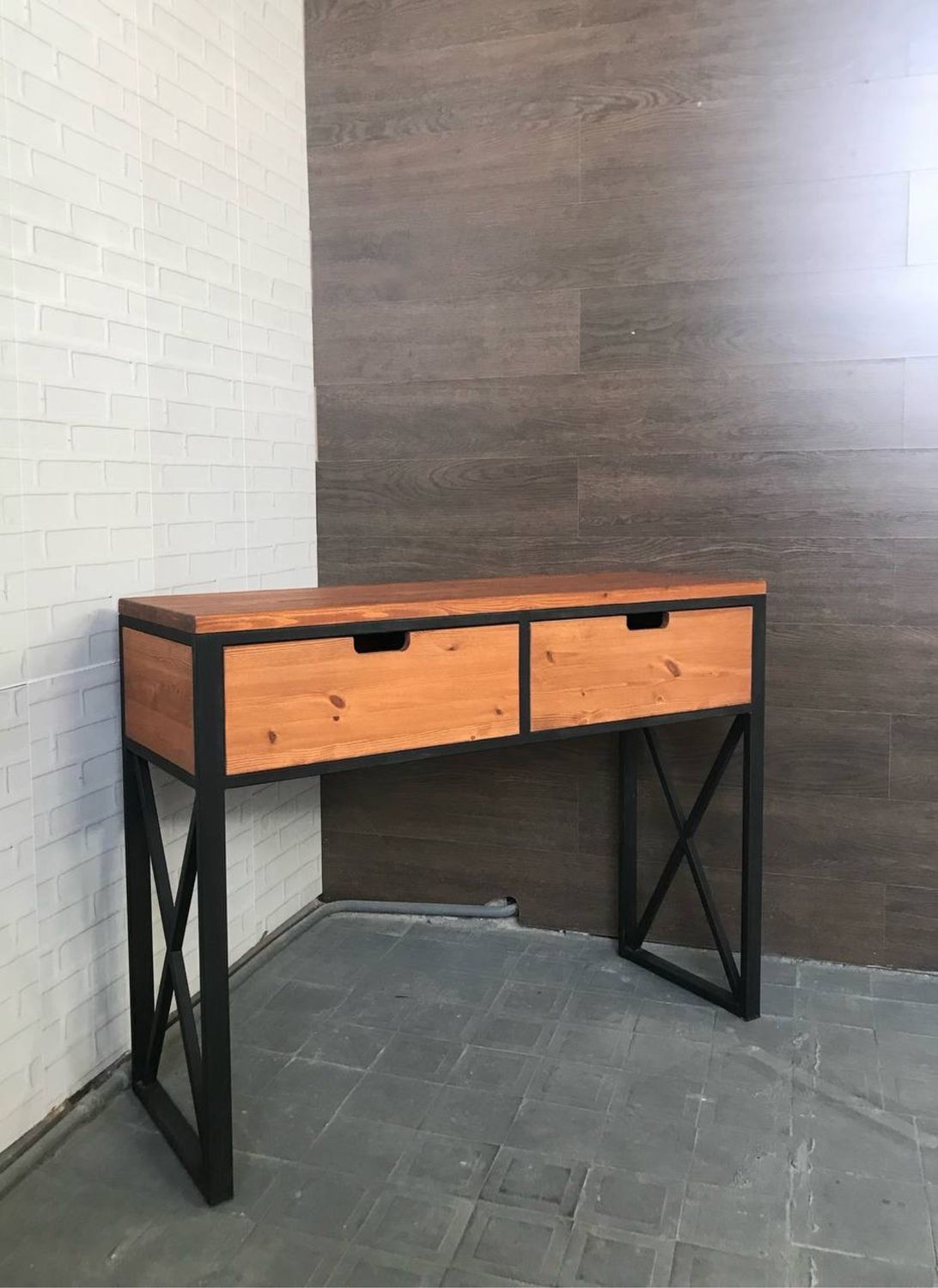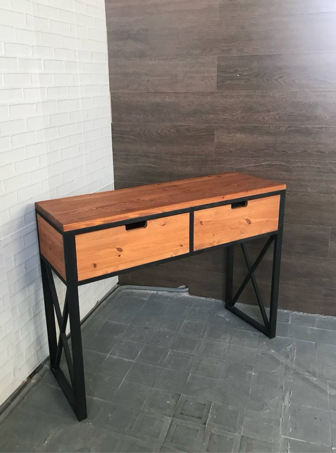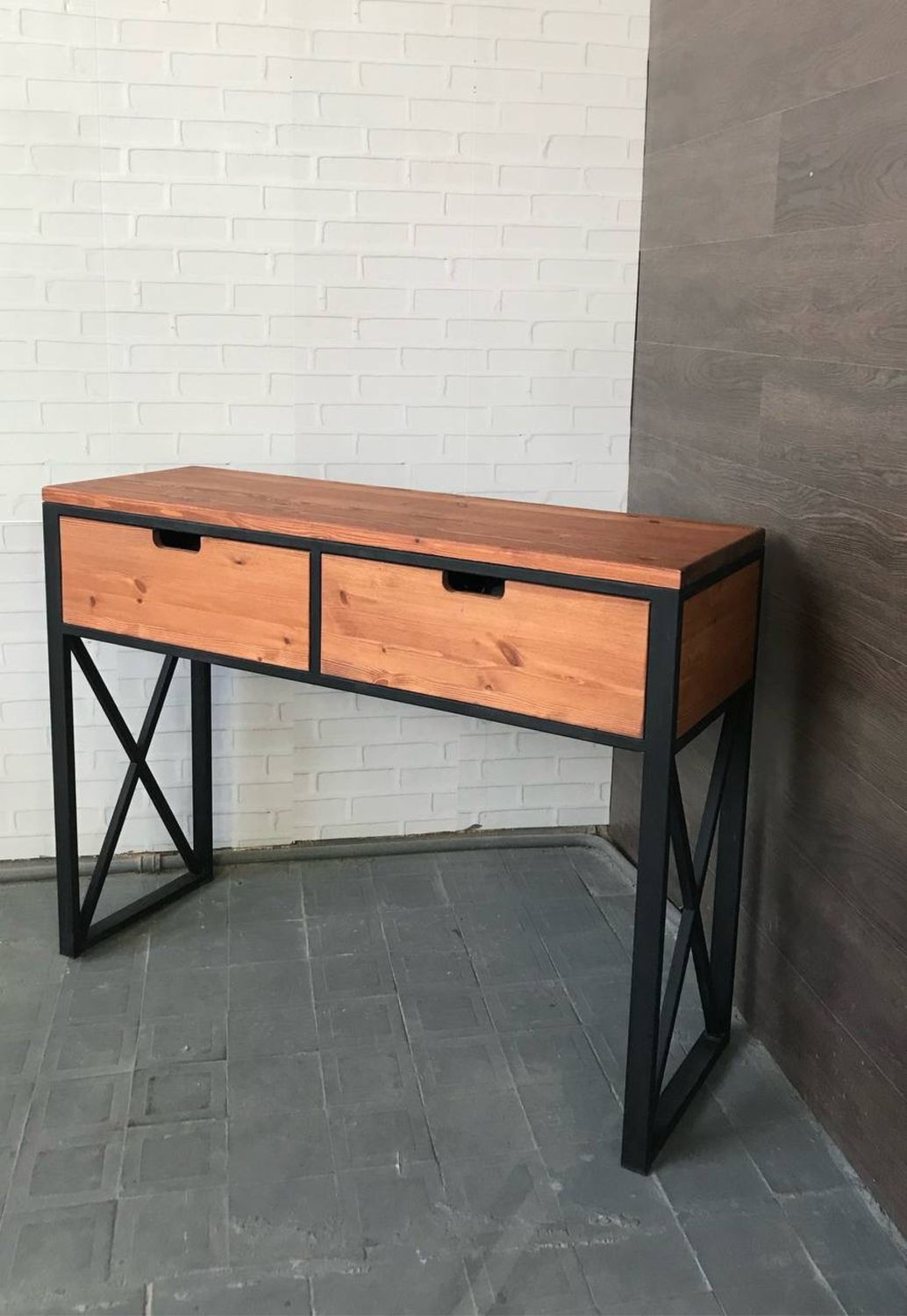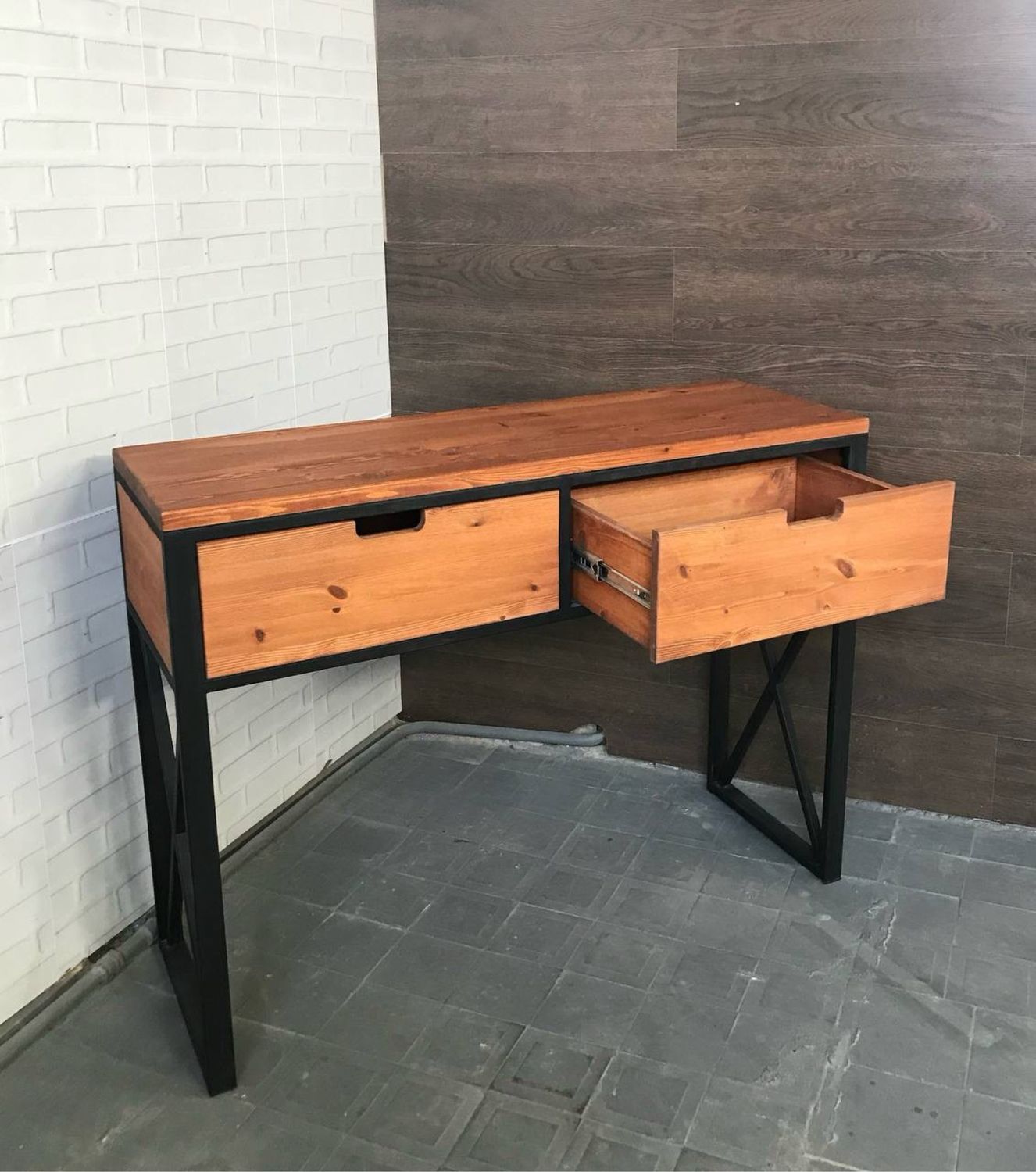 Консоль в стиле лофт с двумя выдвижными ящиками на направляющих с доводчиками изготовлена из массива сосны и металлического профиля.