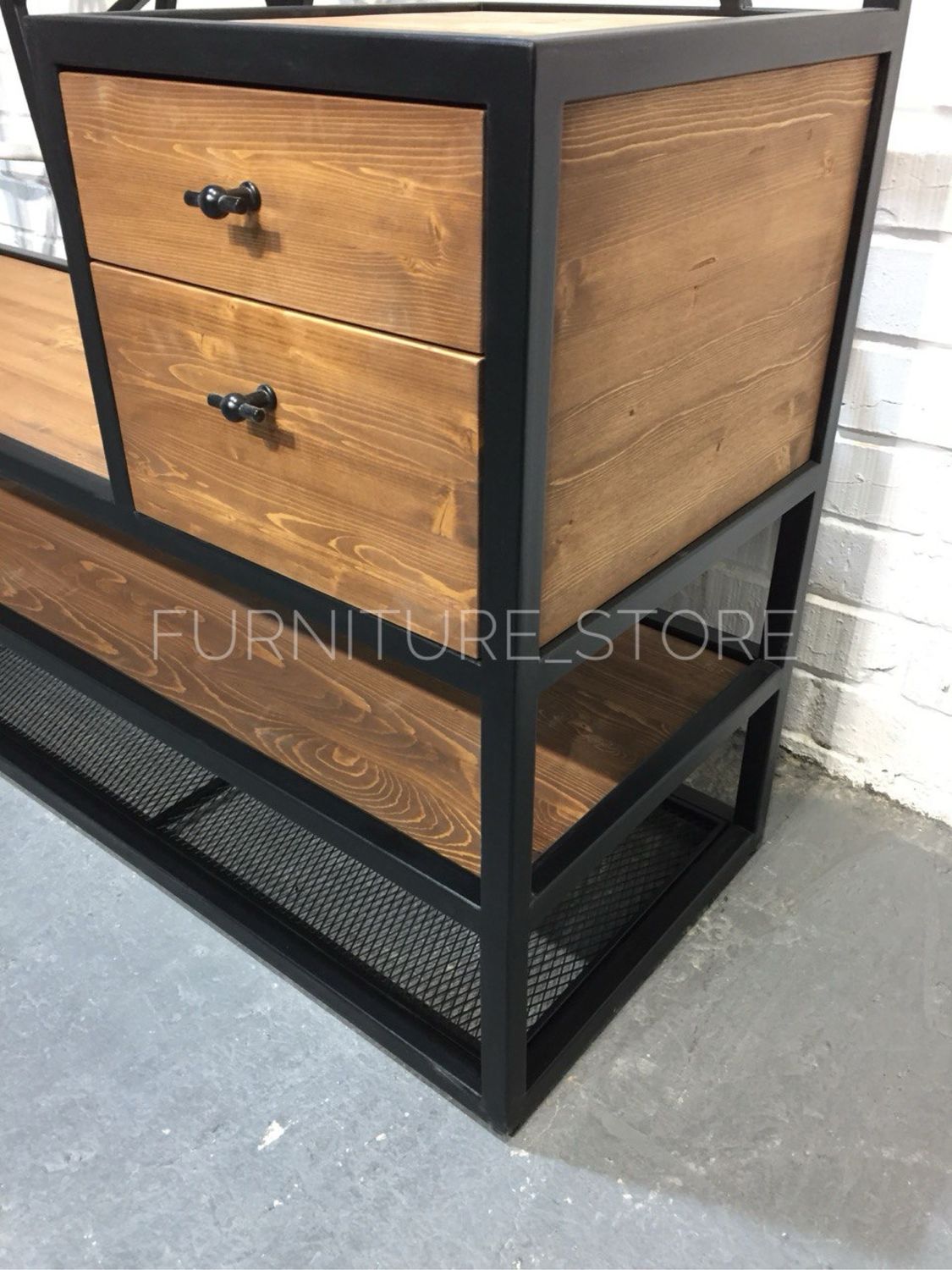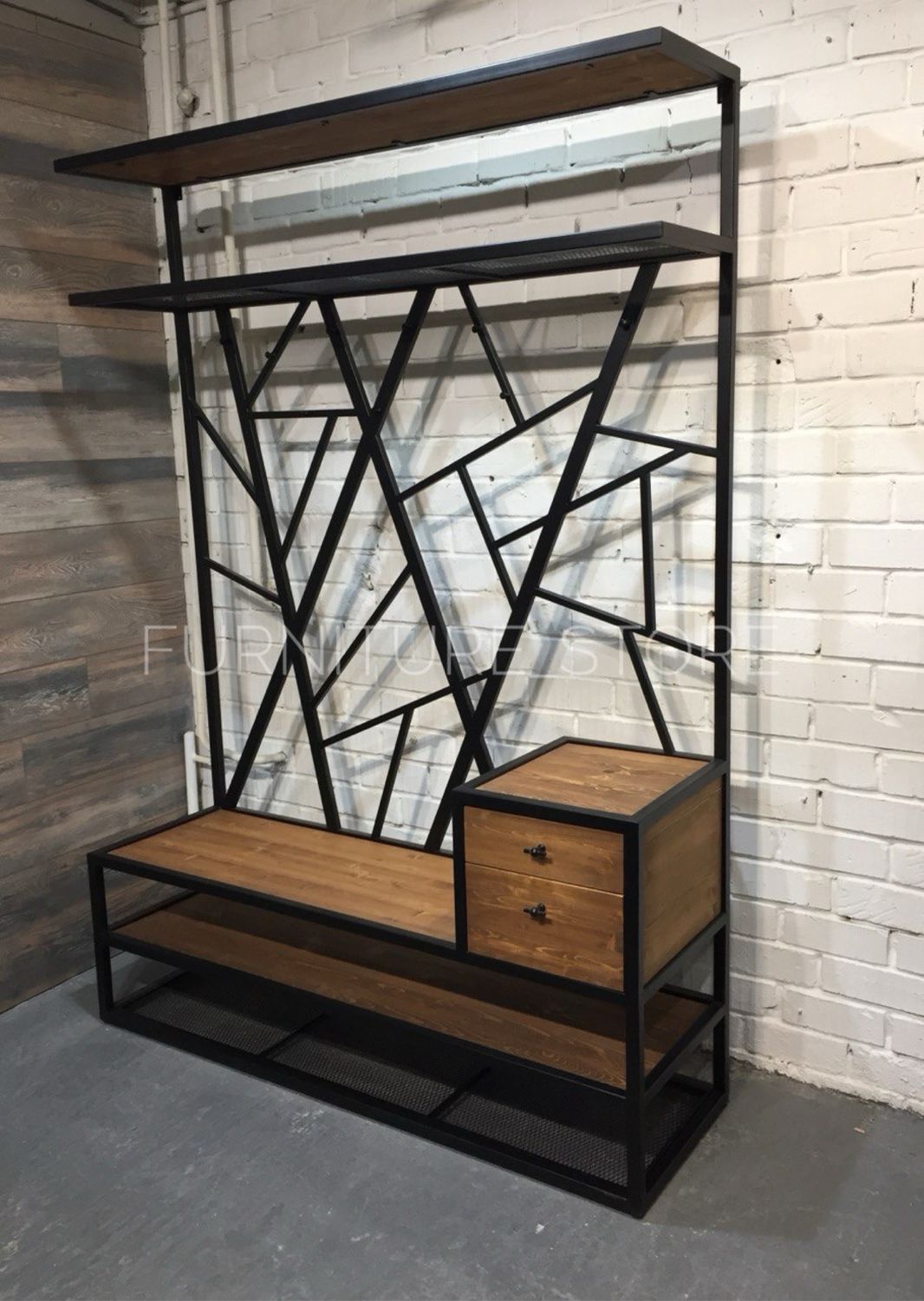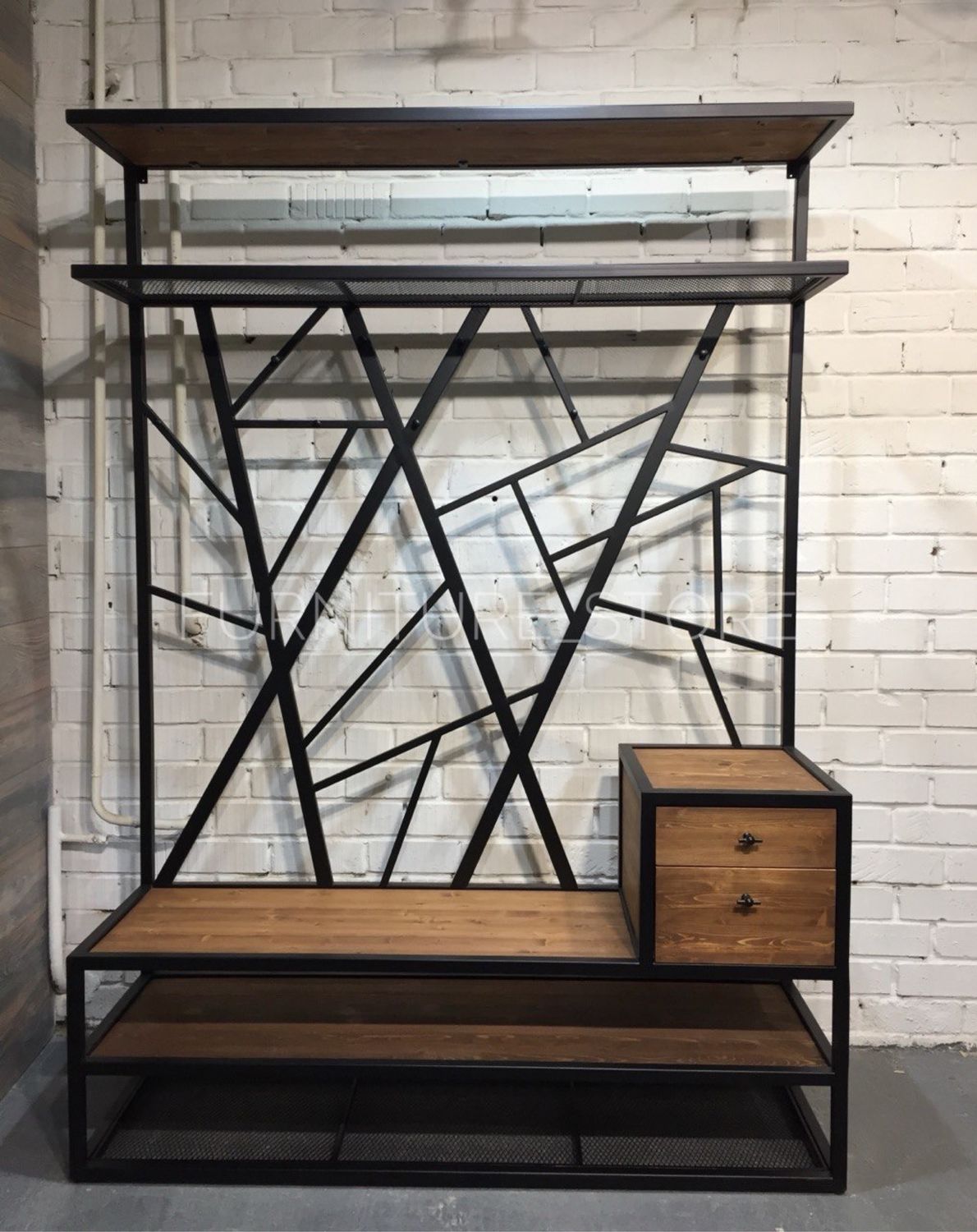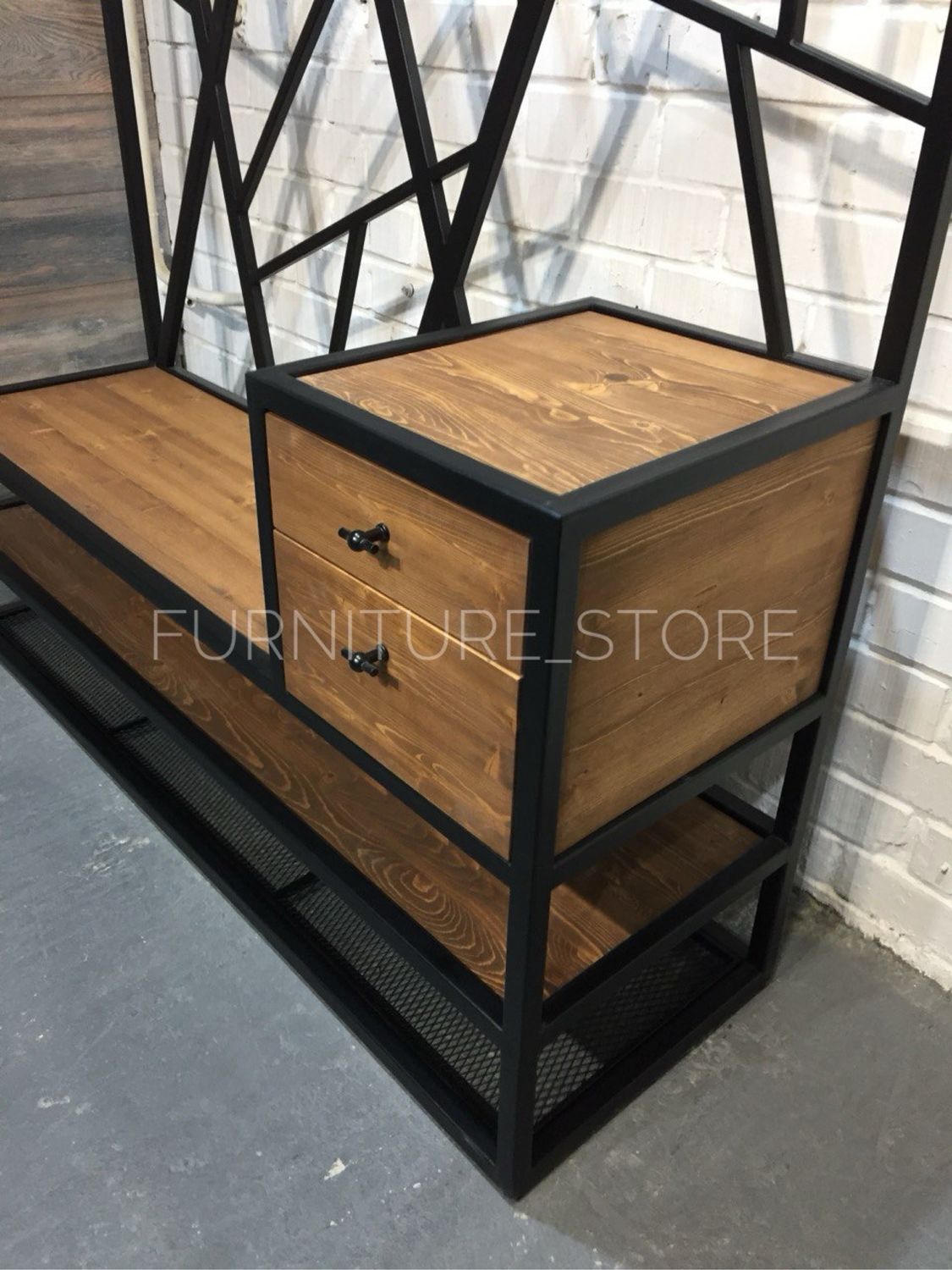 Прихожая в стиле лофт с двумя выдвижными ящиками на направляющих с доводчиками изготовлена из сосны и металла. На заказ изменим размеры и цвет, количество и расположение ящиков.
