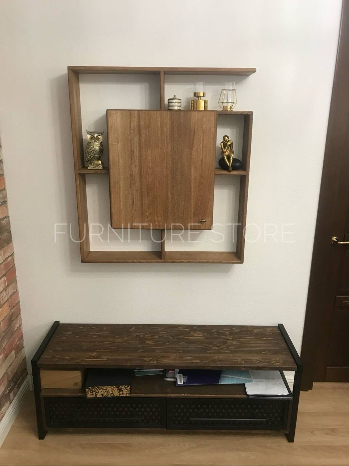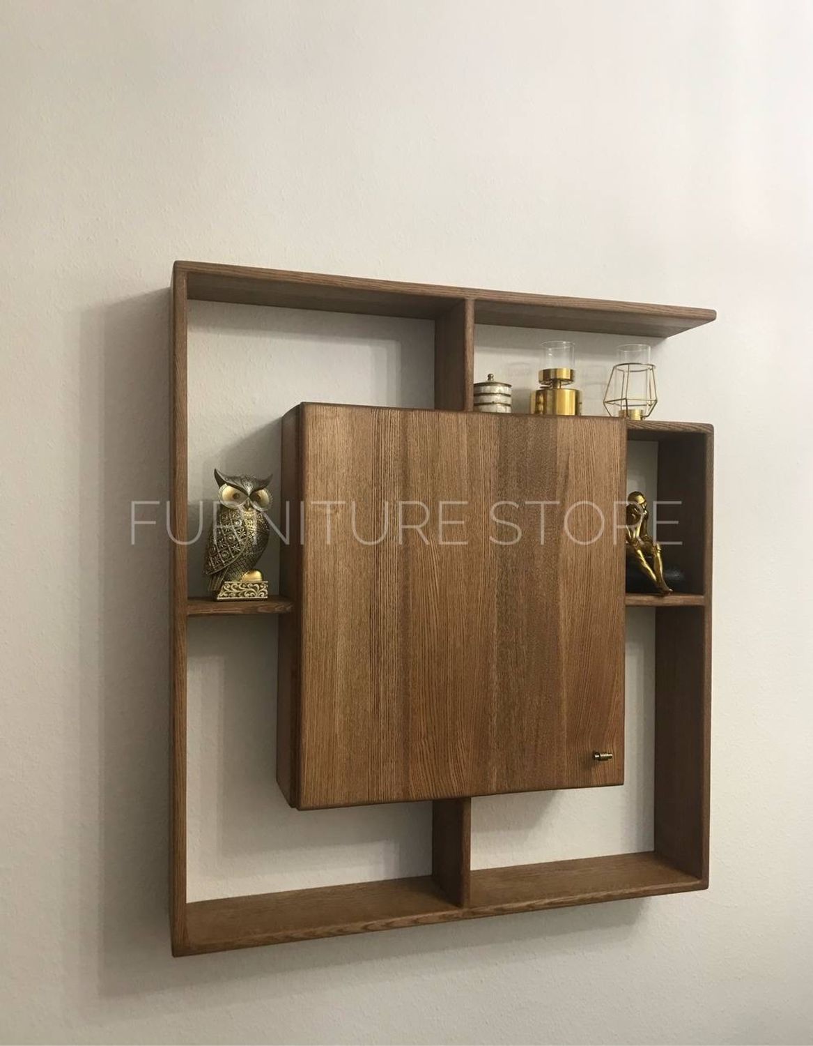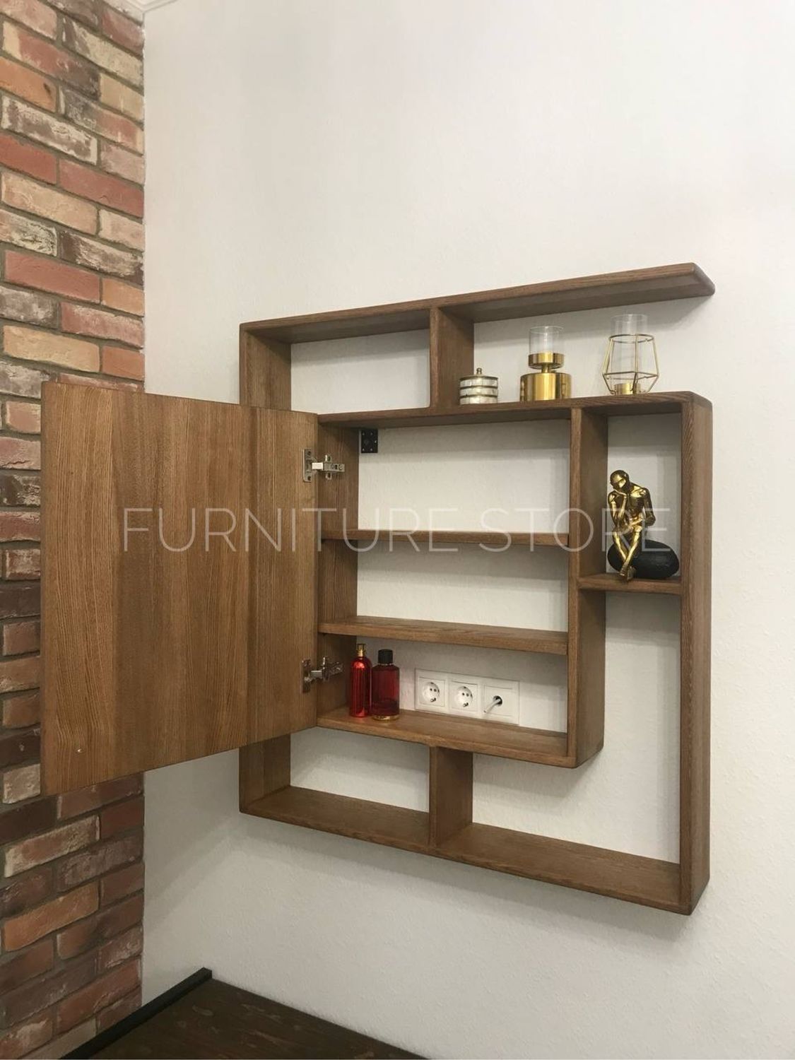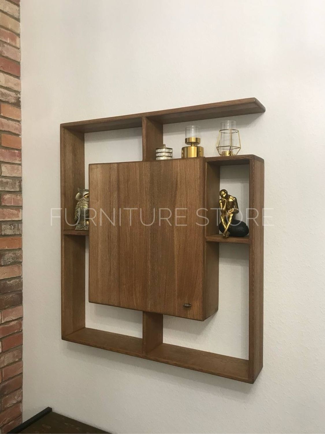 Конструкция полки представляет собой сложную геометрическую композицию из открытых и закрытых секций. Центральное место занимает вместительный закрытый шкафчик с дверцей, оснащенный удобной маленькой ручкой, идеально подходящий для хранения мелких предметов, или аксессуаров. Вокруг шкафчика расположены открытые ниши различных размеров, которые предлагают широкие возможности для размещения декоративных элементов, фотографий, сувениров и других мелочей, создавая неповторимый уютный уголок. Глубина полок идеально подобрана для комфортного размещения предметов.