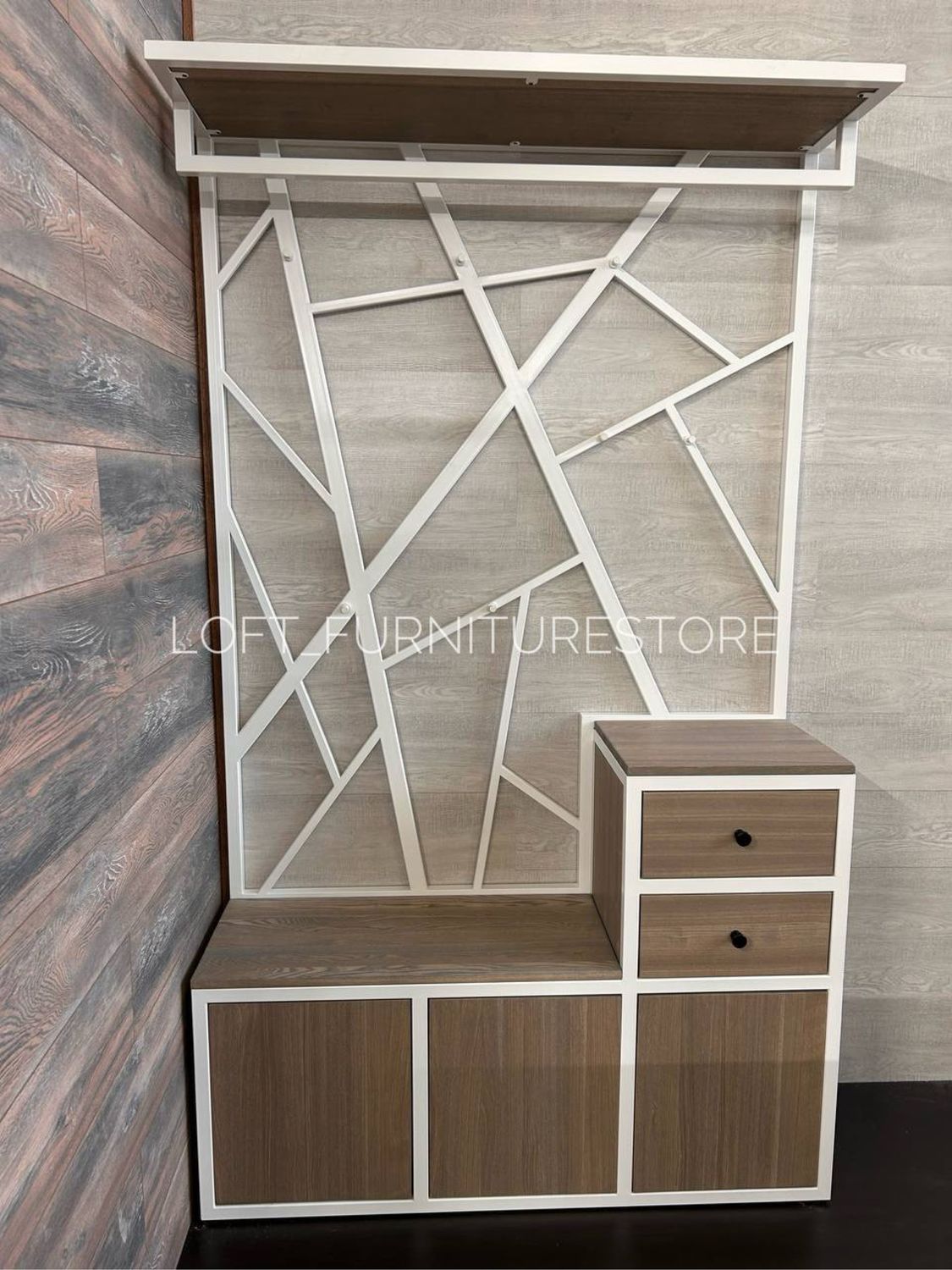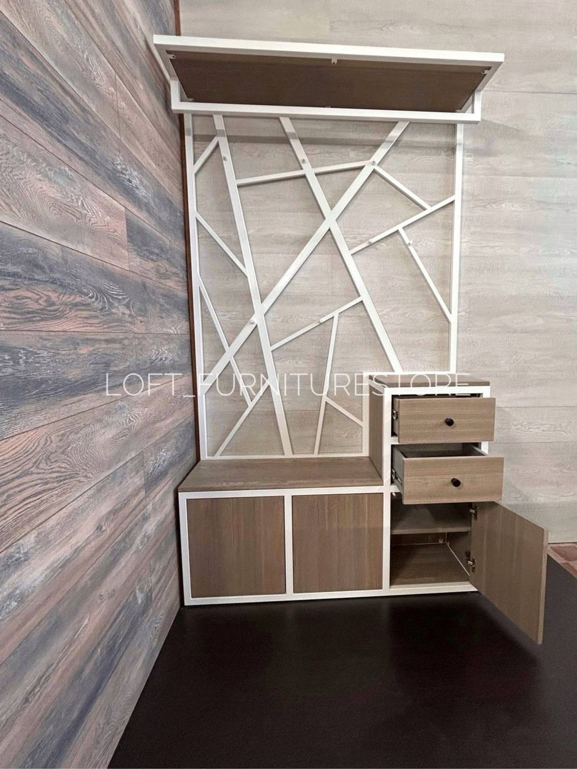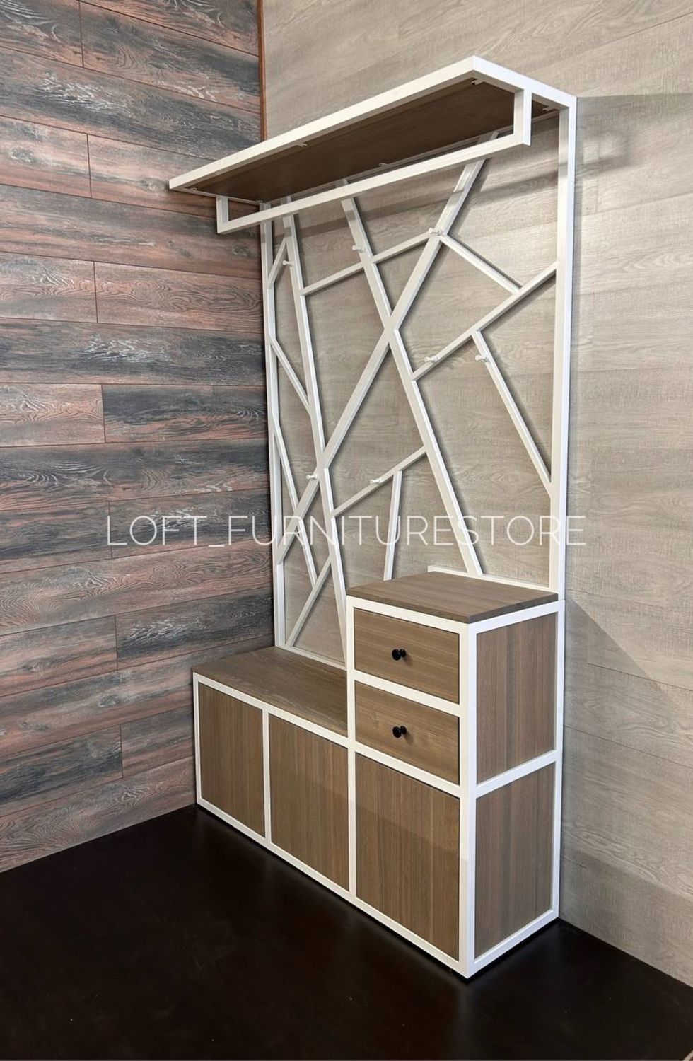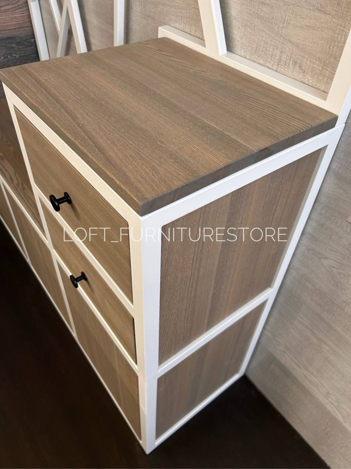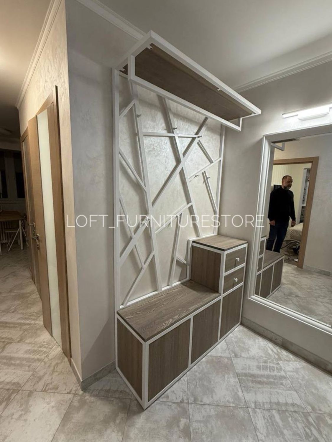 Прихожая в стиле лофт изготовлена из массива ясеня и металлического профиля. Выдвижные ящики оснащены направляющими с доводчиками. Дерево покрыто тонирующим маслом, металлический профиль покрыт белой порошковой краской.