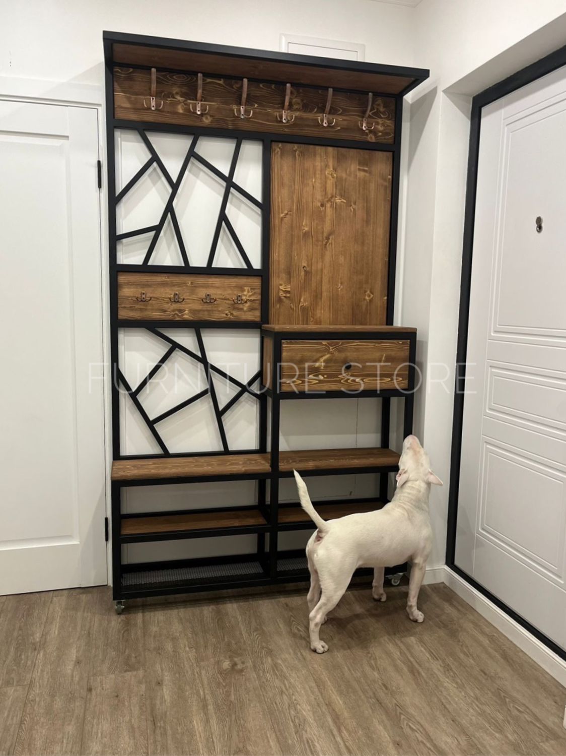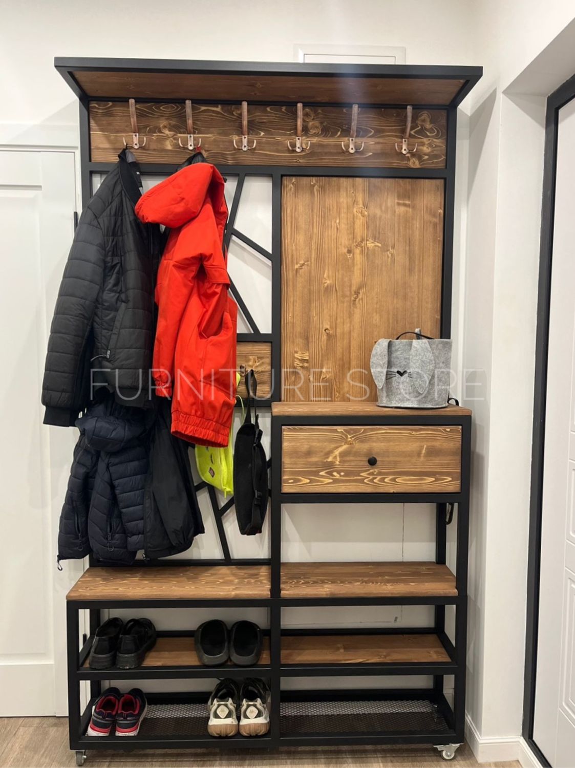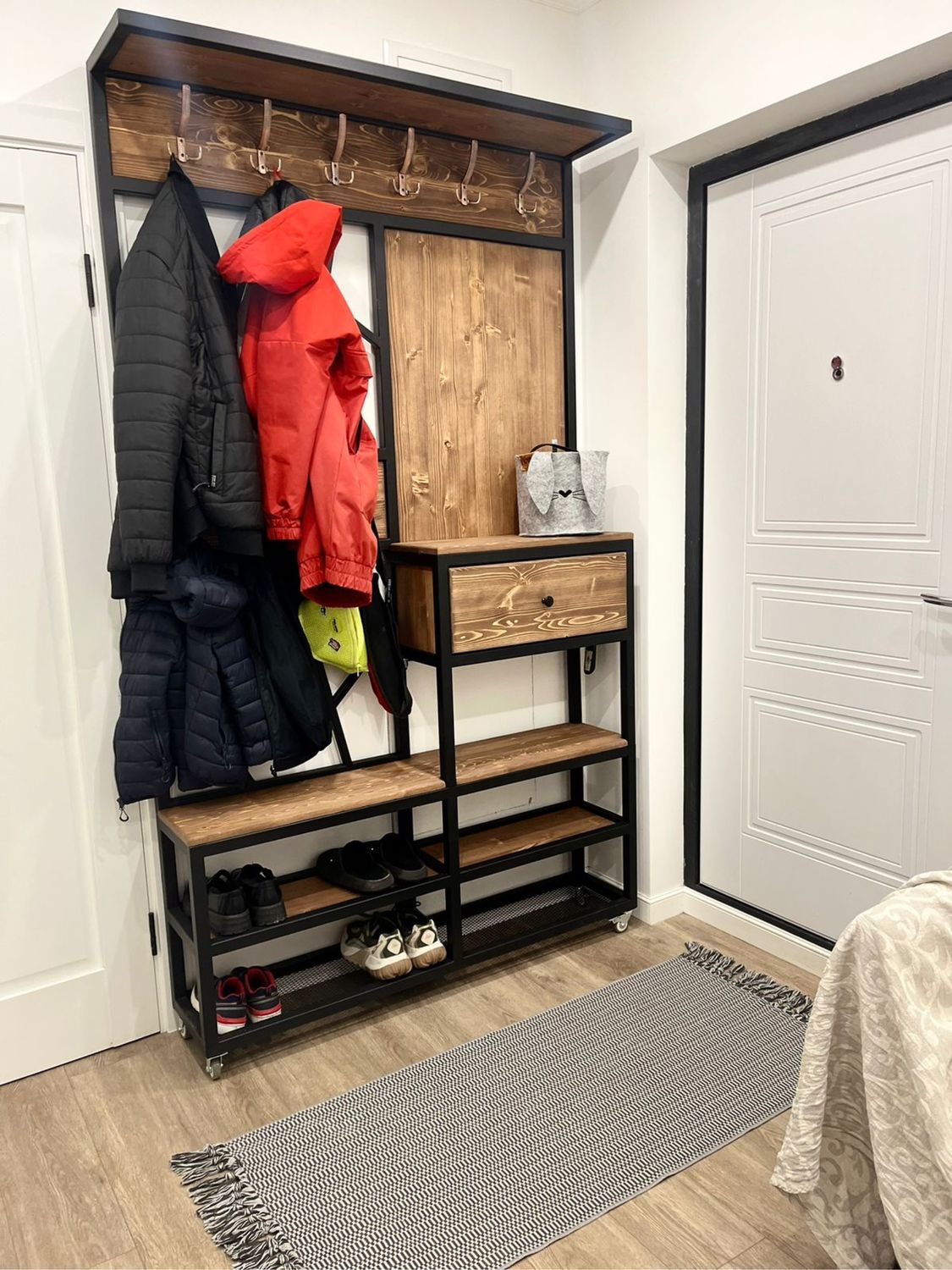 Прихожая лофт выполнена из прочного металлического профиля с порошковым покрытием, гарантирующим долговечность и устойчивость к повреждениям. Деревянные элементы изготовлены из натурального массива сосны, обработанного тонирующим маслом, которое одновременно с приданием цвета, защищает дерево от влаги и механических воздействий. Тёплый оттенок дерева прекрасно сочетается с строгими линиями металлического каркаса, создавая стильный индустриальный дизайн.