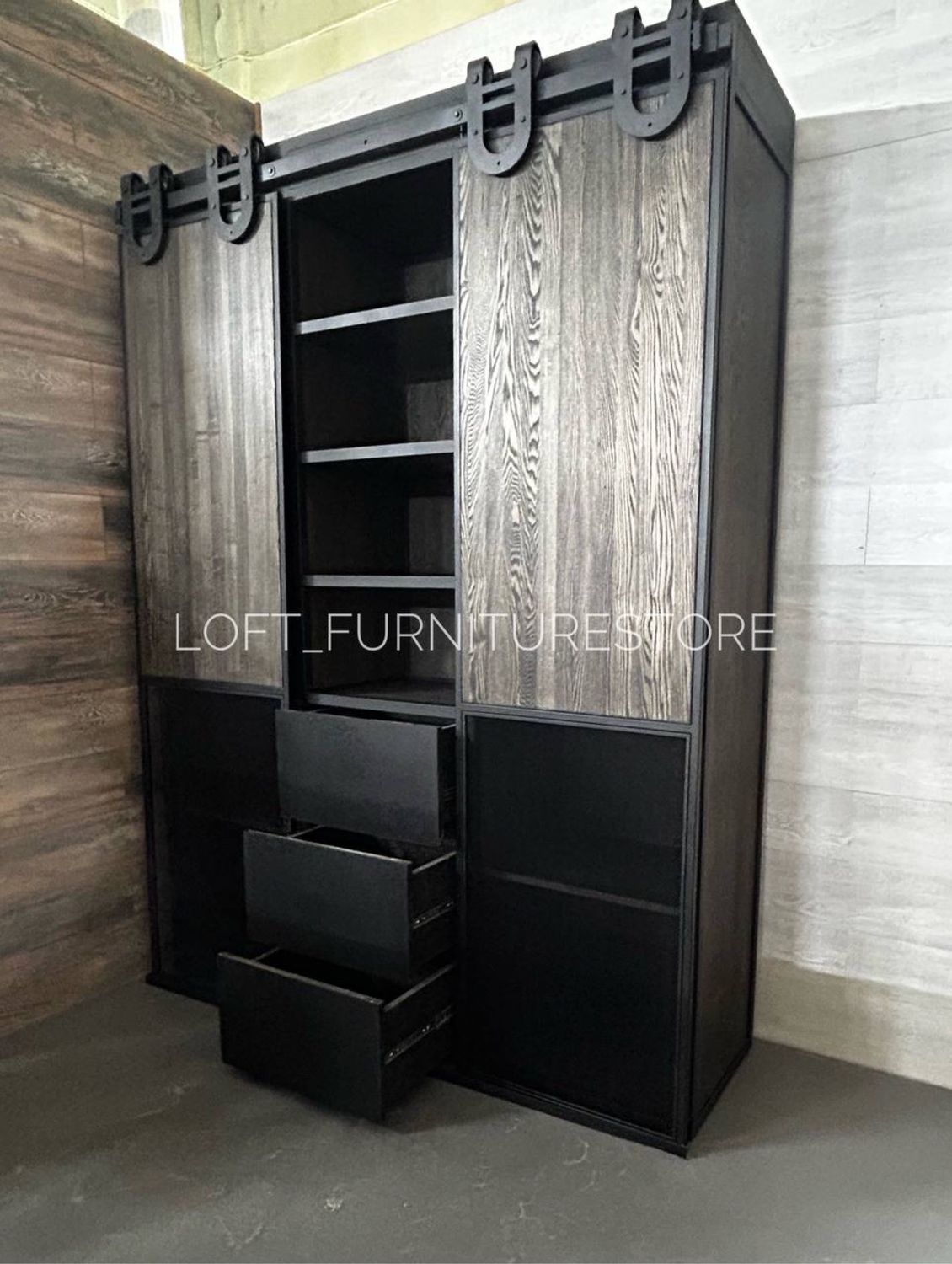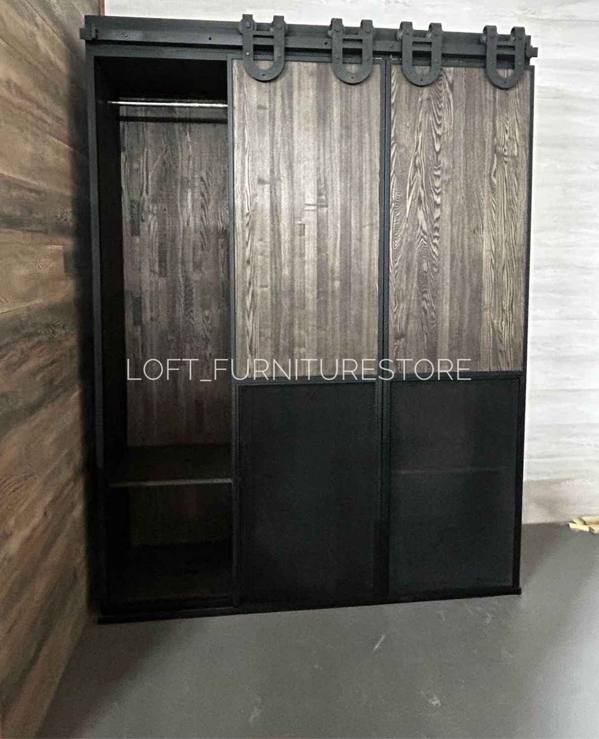 Этот шкаф выполнен в индустриальном стиле с элементами лофта, сочетая прочность металла и естественную красоту натурального дерева.