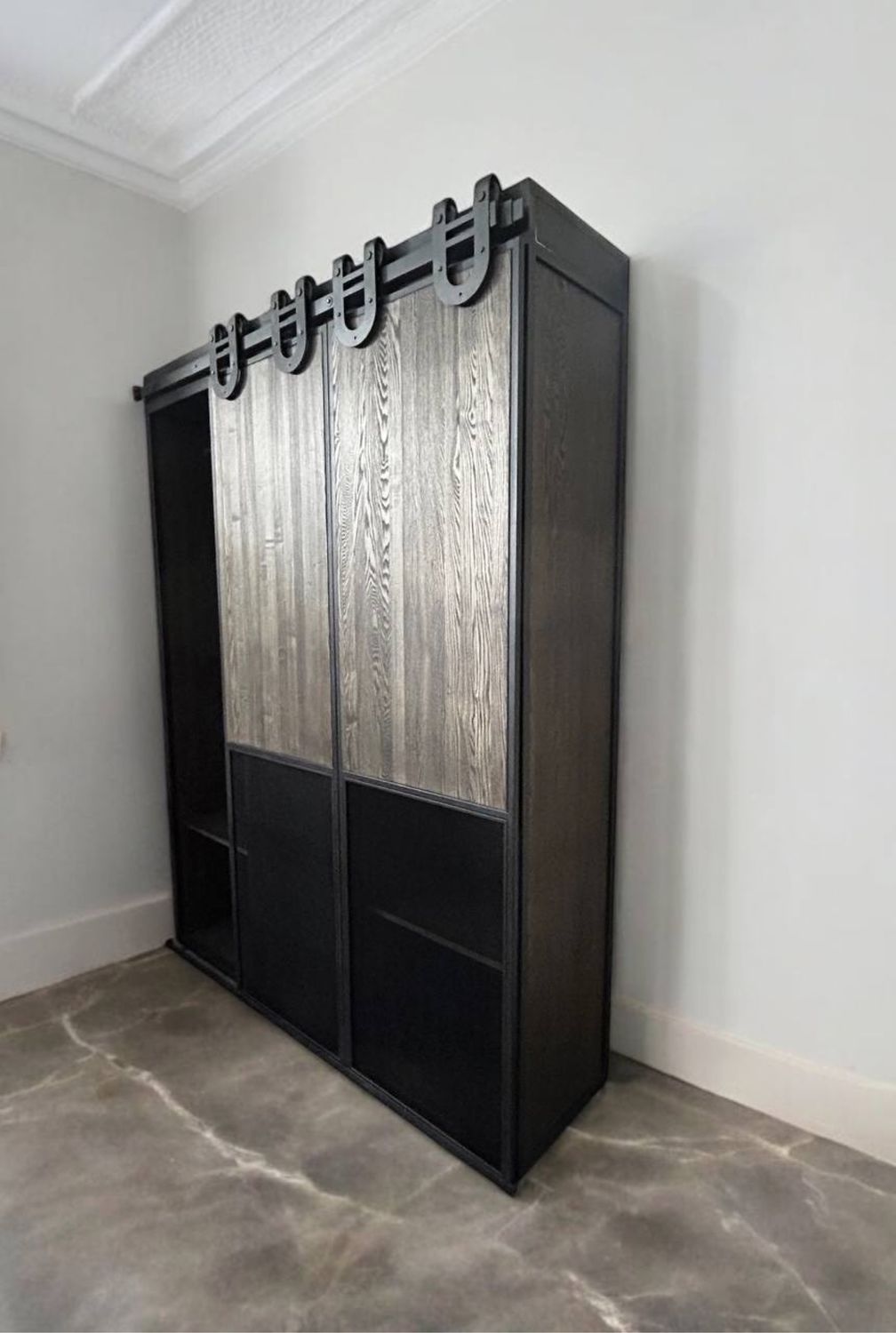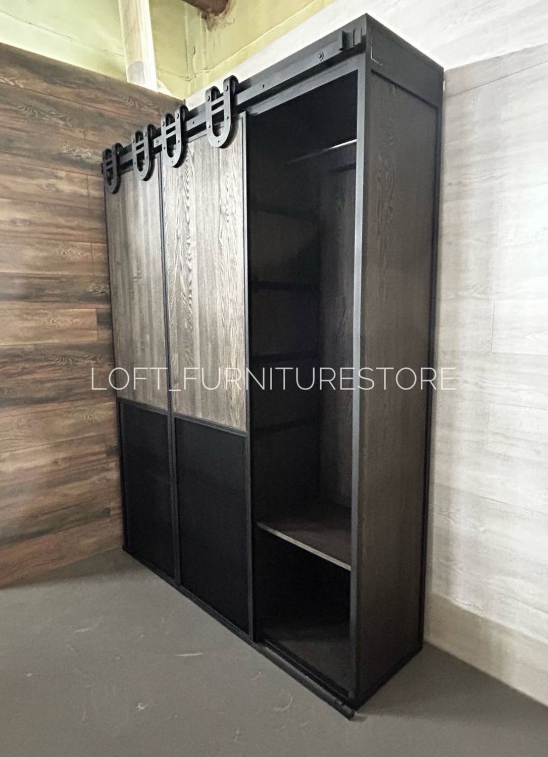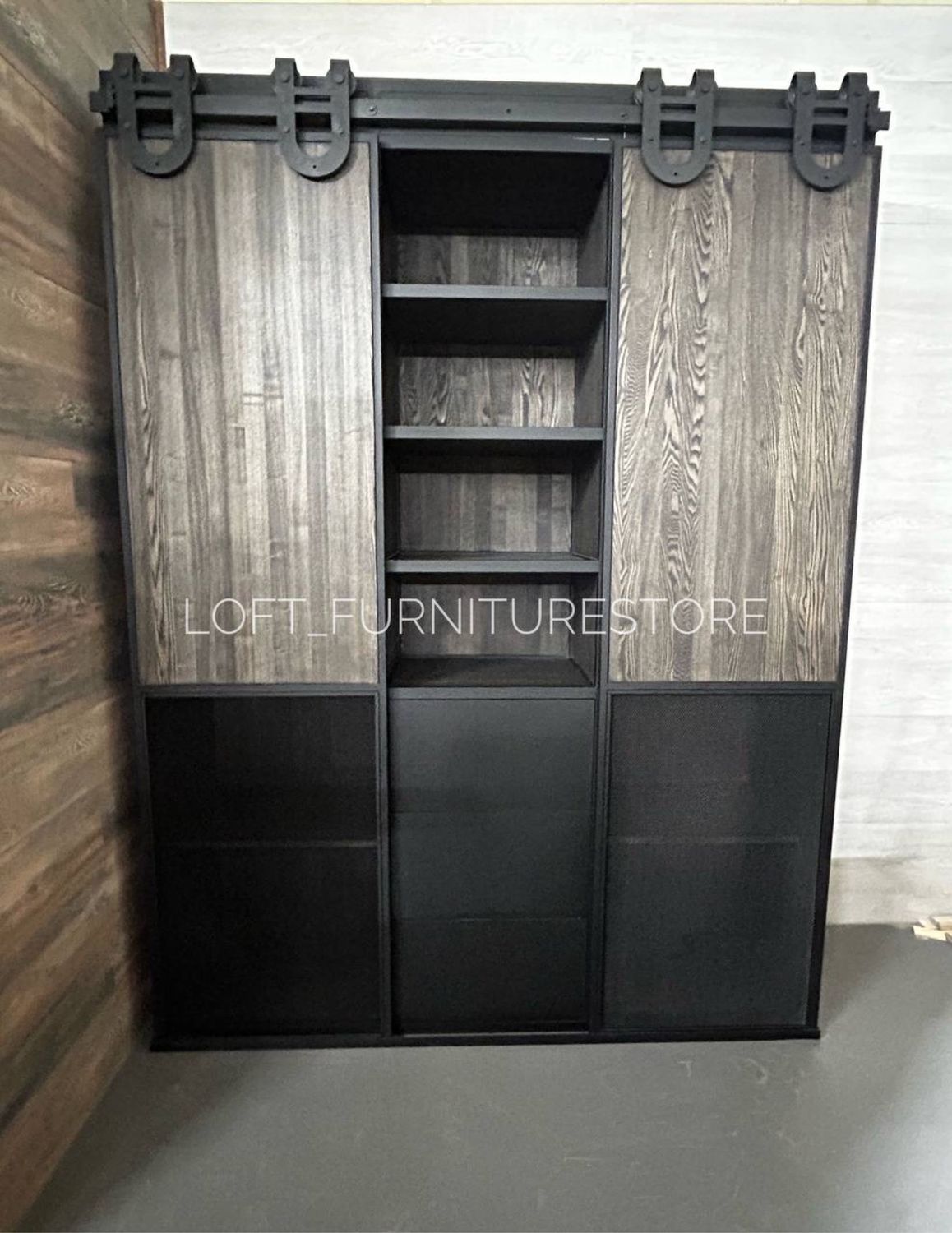 Каркас изготовлен из прочного металла, покрытого порошковой краской, что придаёт конструкции устойчивость к механическим повреждениям и коррозии. Главной особенностью шкафа является амбарный механизм раздвижных дверей-купе, который не только удобен, но и подчёркивает стильный дизайн. Двери декорированы металлической сеткой, создавая эффект лёгкости и добавляя интерьеру брутальности.