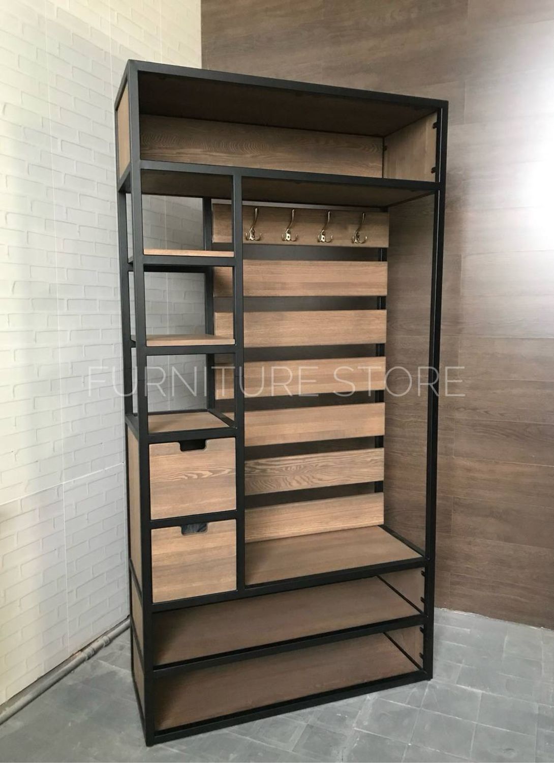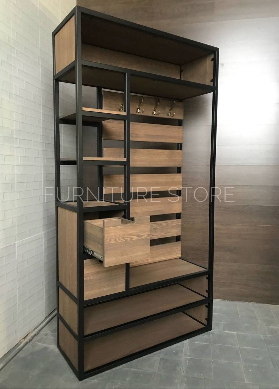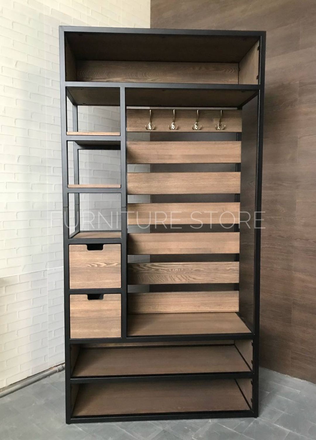 Дизайнерская прихожая в стиле лофт изготовлена из массива ясеня и металлического профиля. В прихожей предусмотрены два выдвижных ящика на направляющих с доводчиками для хранения небольших вещей. Ясень покрыт тонирующим маслом по дереву "варатан". Металлический профиль покрыт порошковой краской по металлу.