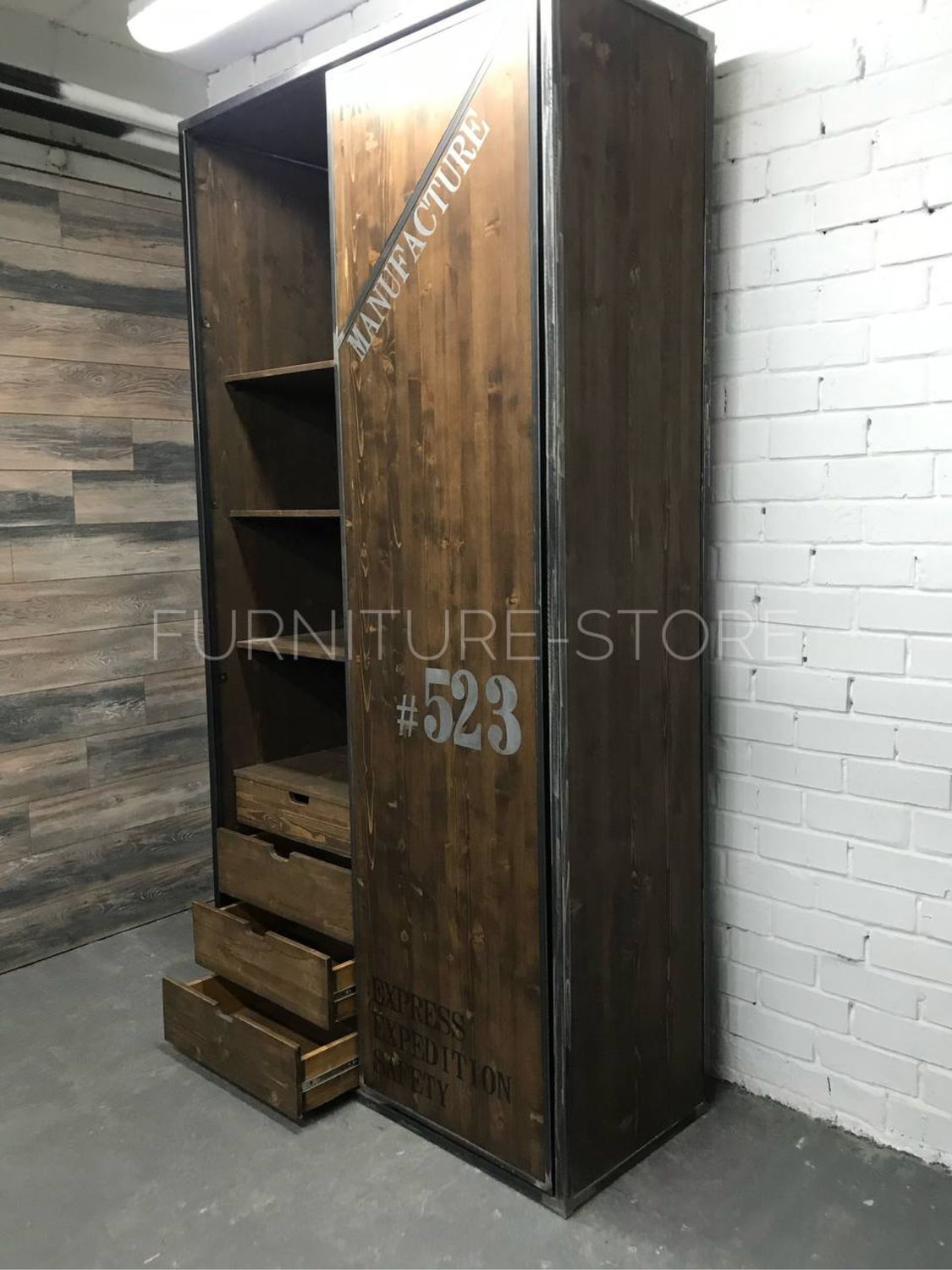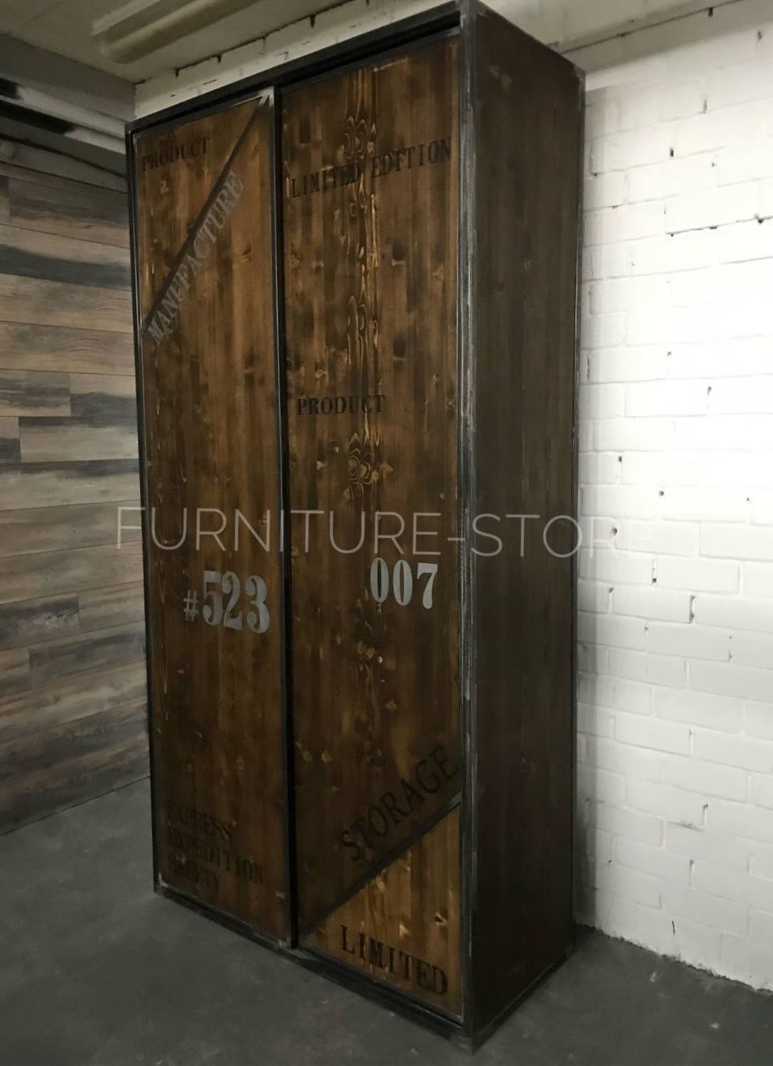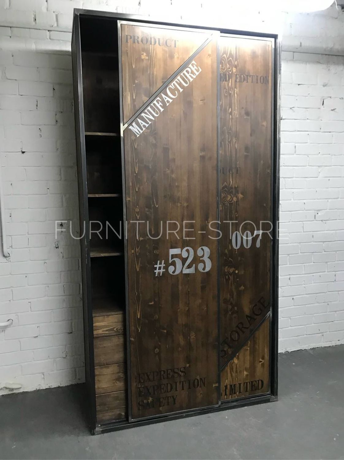 Шкаф-купе в стиле лофт выполнен из сосны и металлического профиля. Двери шкафа декорированы надписями. Сосна покрыта тонирующим маслом по дереву, металлический профиль покрыт порошковой краской по металлу. Наполнение шкафа предусматривает полки для хранения вещей, штанги для одежды, выдвижные ящики на направляющих с доводчиками.