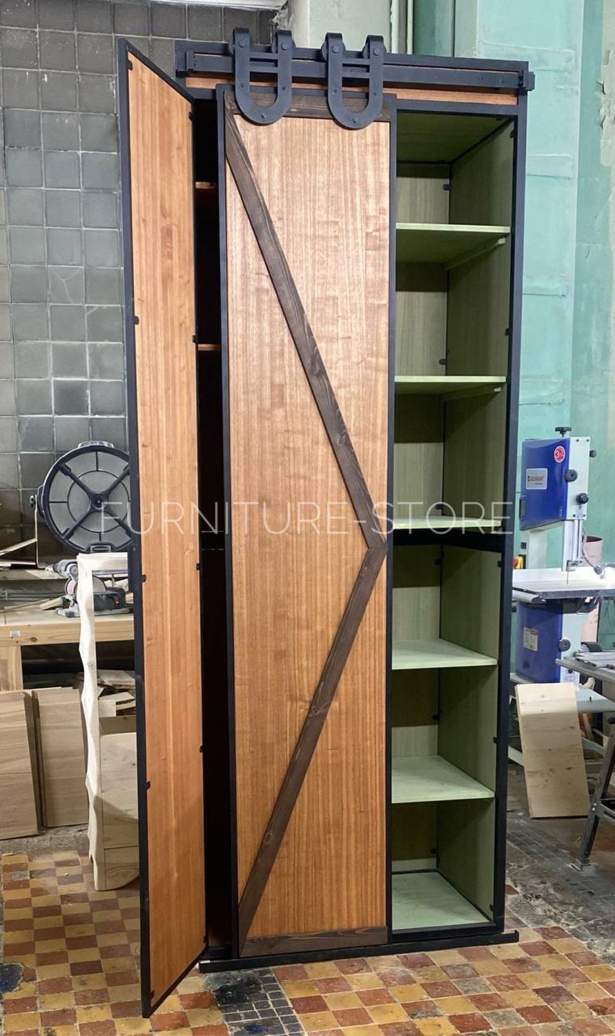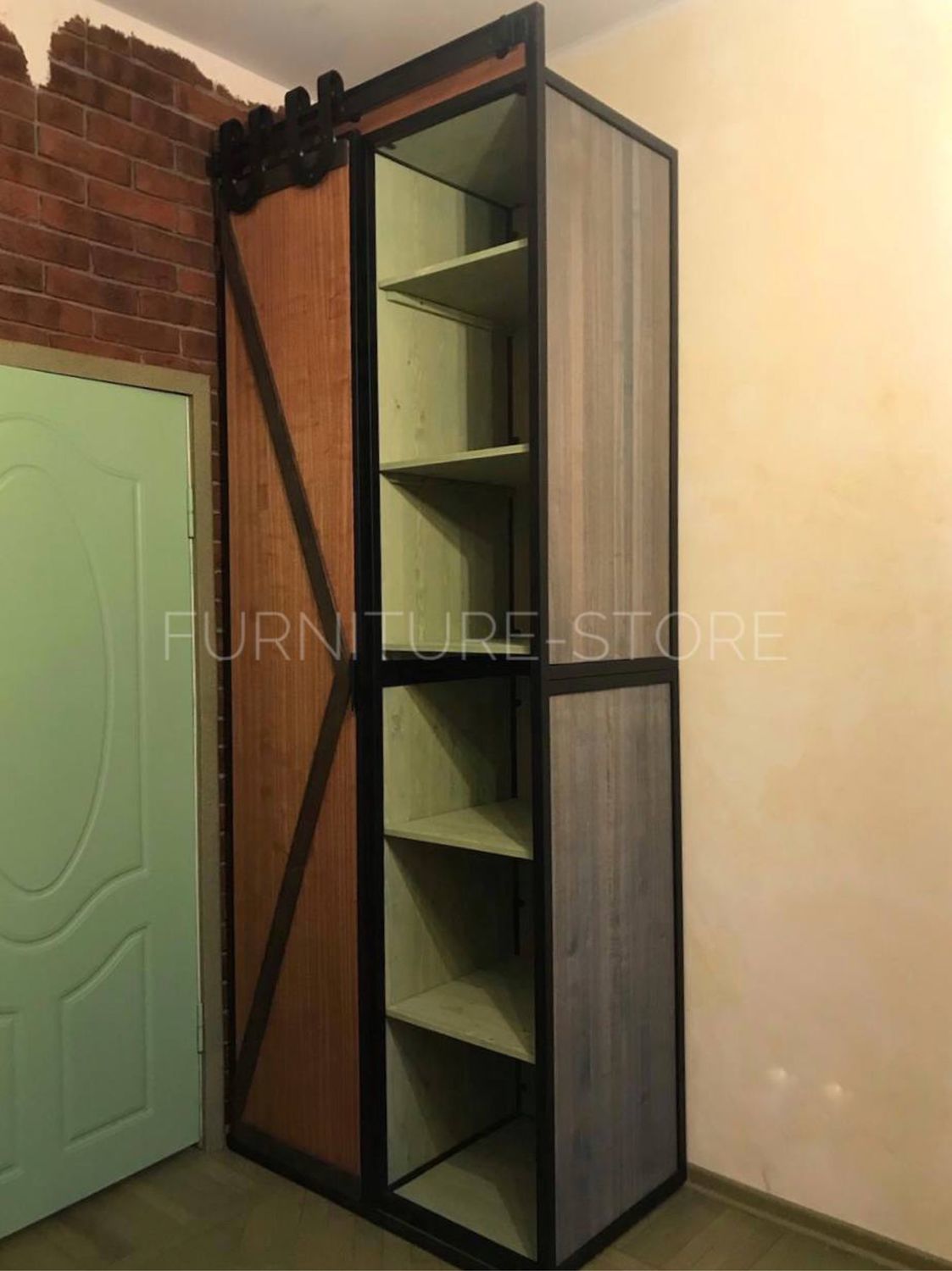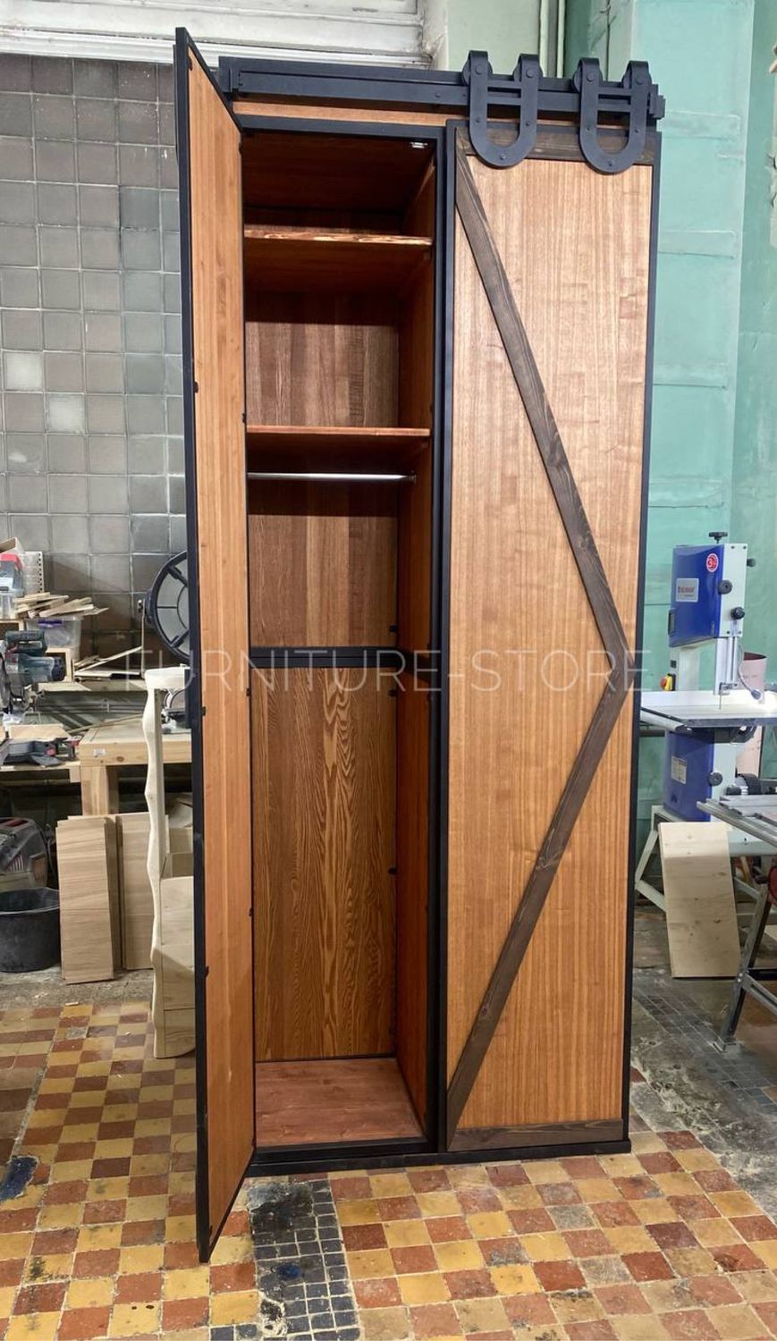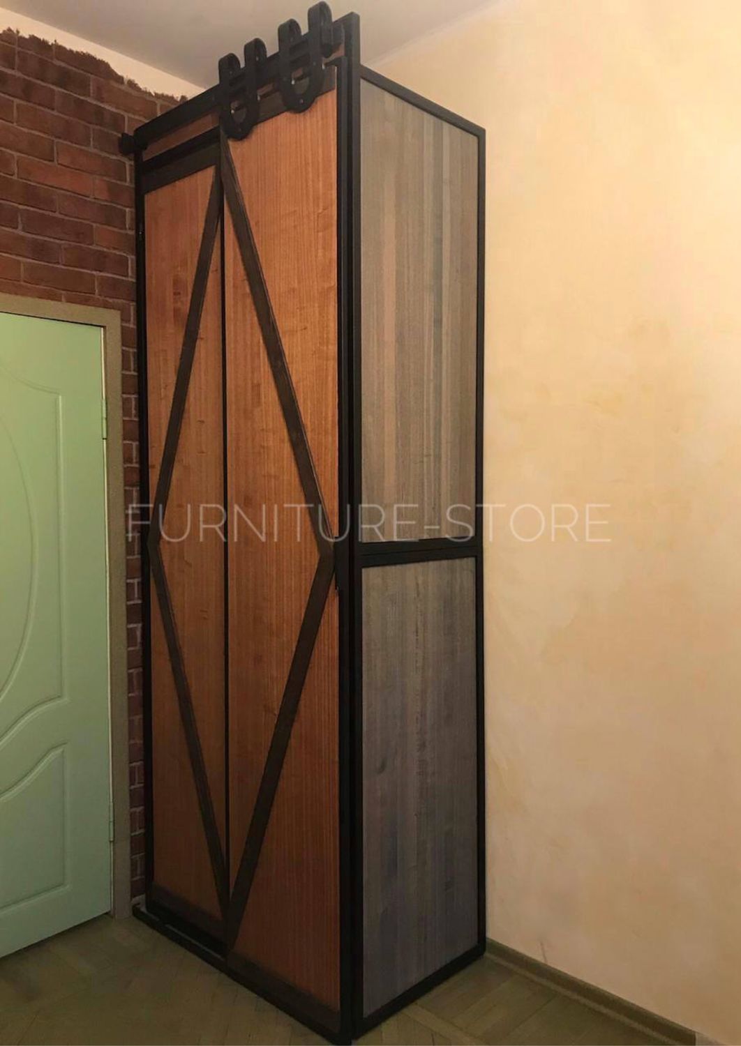 Шкаф в стиле лофт с амбарным механизмом выполнен из массива ясеня и металлического профиля. Одна из дверей шкафа открывается по типу купе. Ясень покрыт тремя оттенками тонирующего масла по дереву. Металлический профиль покрыт порошковой краской по металлу.