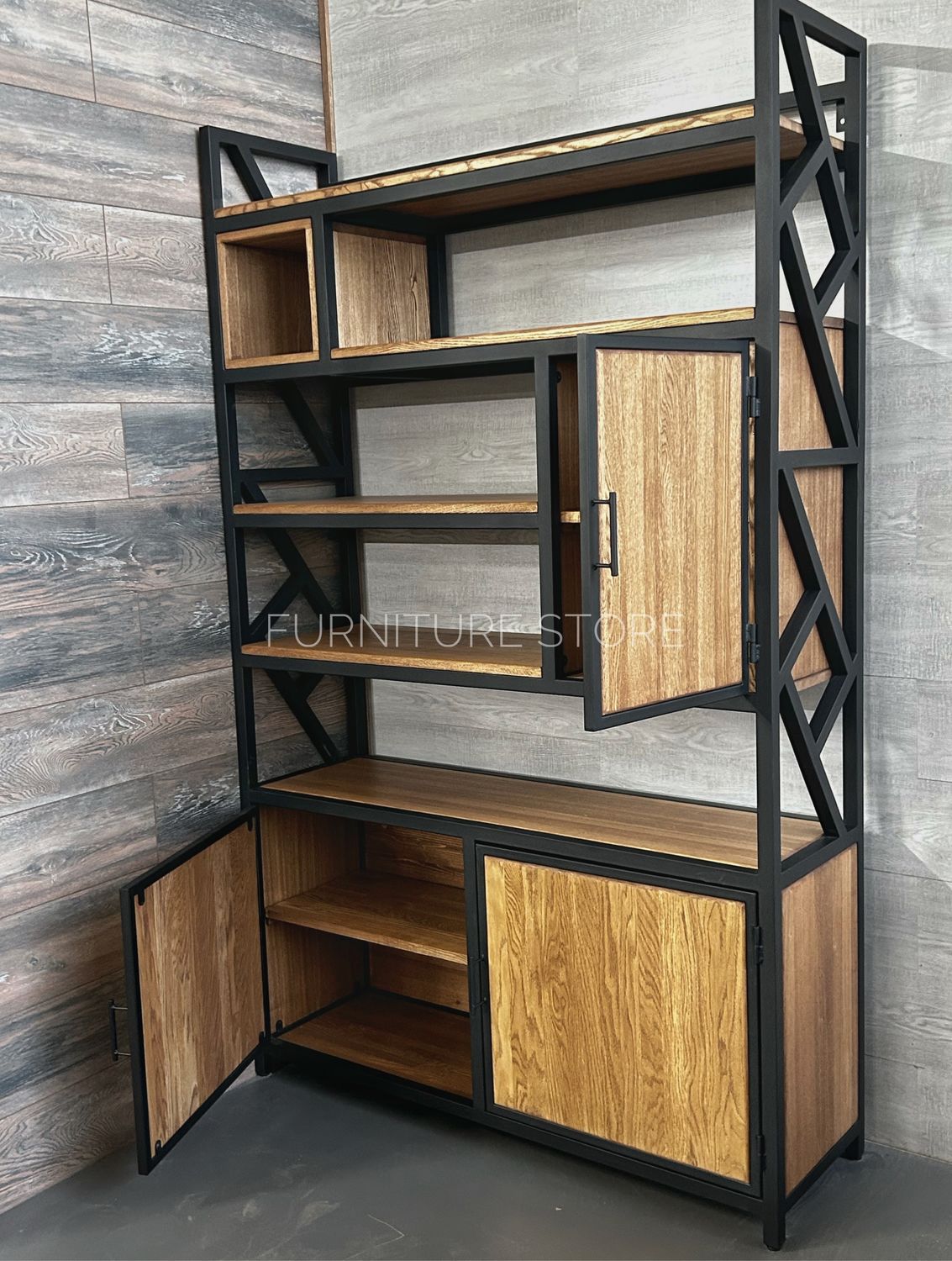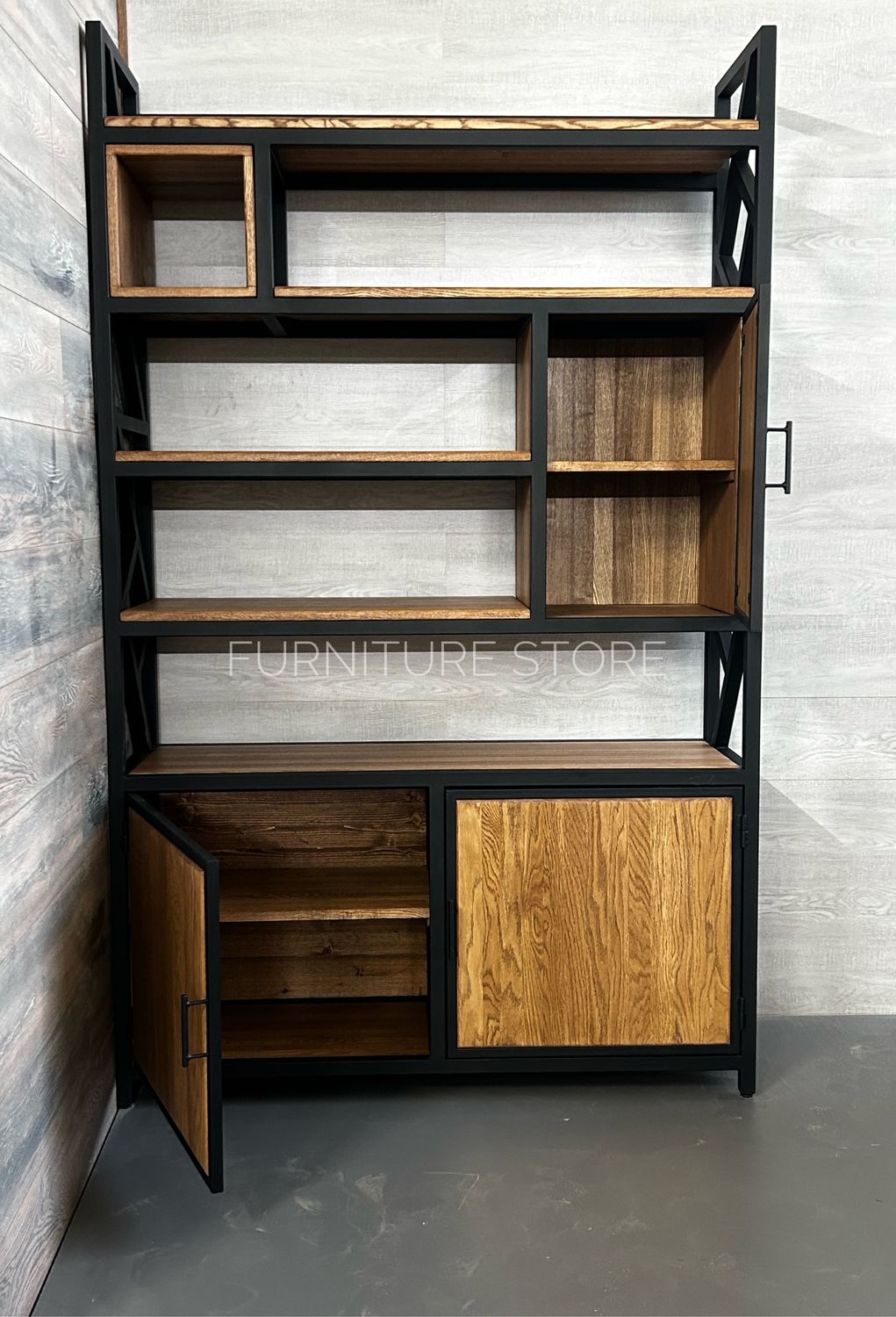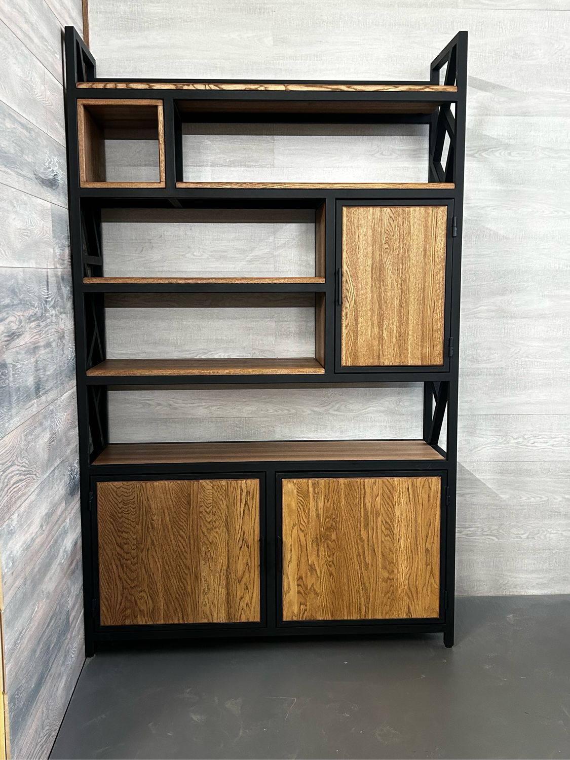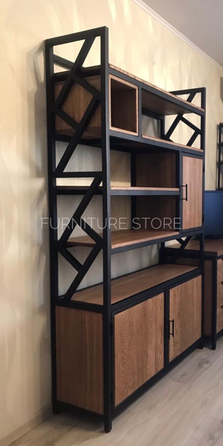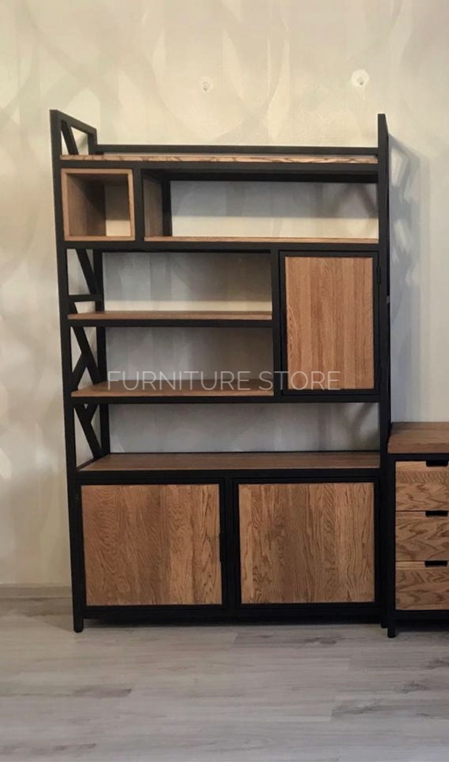 Стеллаж в стиле лофт — это современная мебель, сочетающая массив дуба и металлический профиль. Верхние полки и дверцы шкафов выполнены из натурального дуба, а каркас — из черного металла, что создаёт контраст между тёплым деревом и холодным металлом.