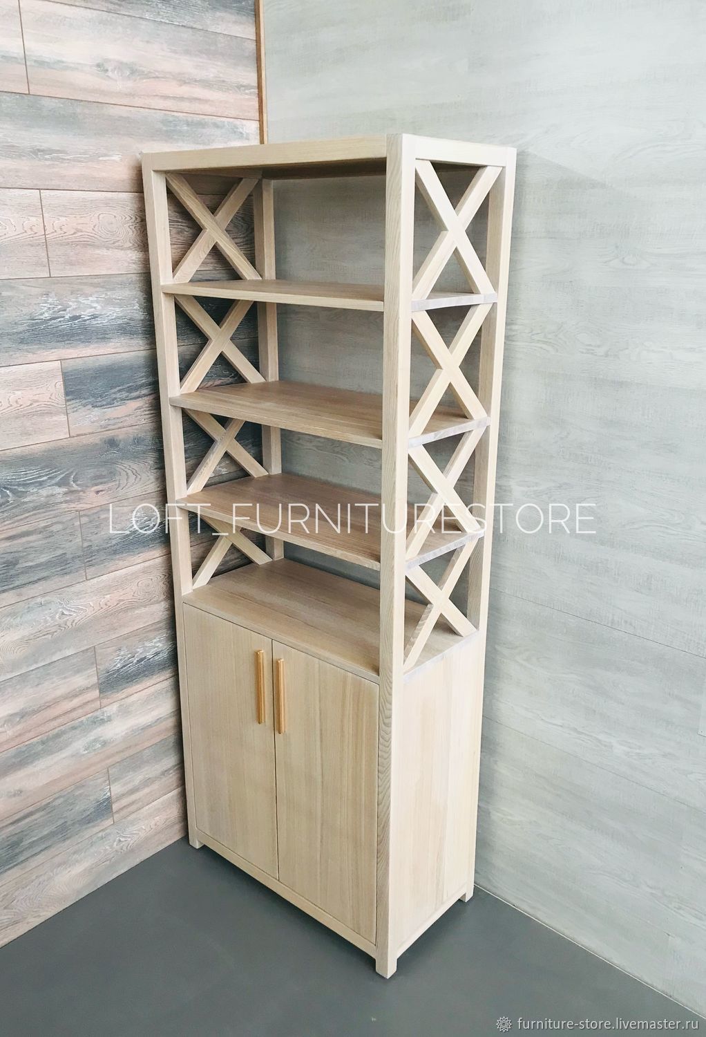 Конструкция продумана до мелочей: открытые полки идеально подойдут для книг, декора или посуды, а закрытый модуль внизу позволяет спрятать то, что не хочется держать на виду. Перекрестные декоративные вставки по бокам придают лёгкости и подчеркивают стиль. Это может быть как скандинавский минимализм, так и лёгкий лофт — всё зависит от интерьера, в который вы его впишете.