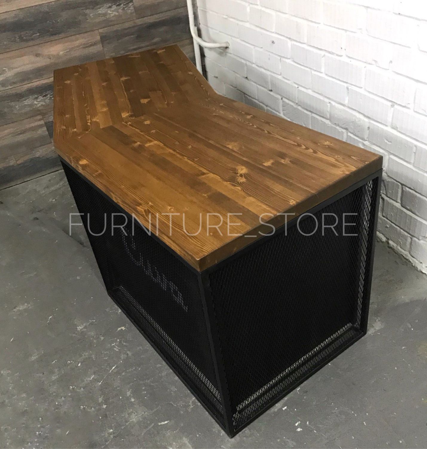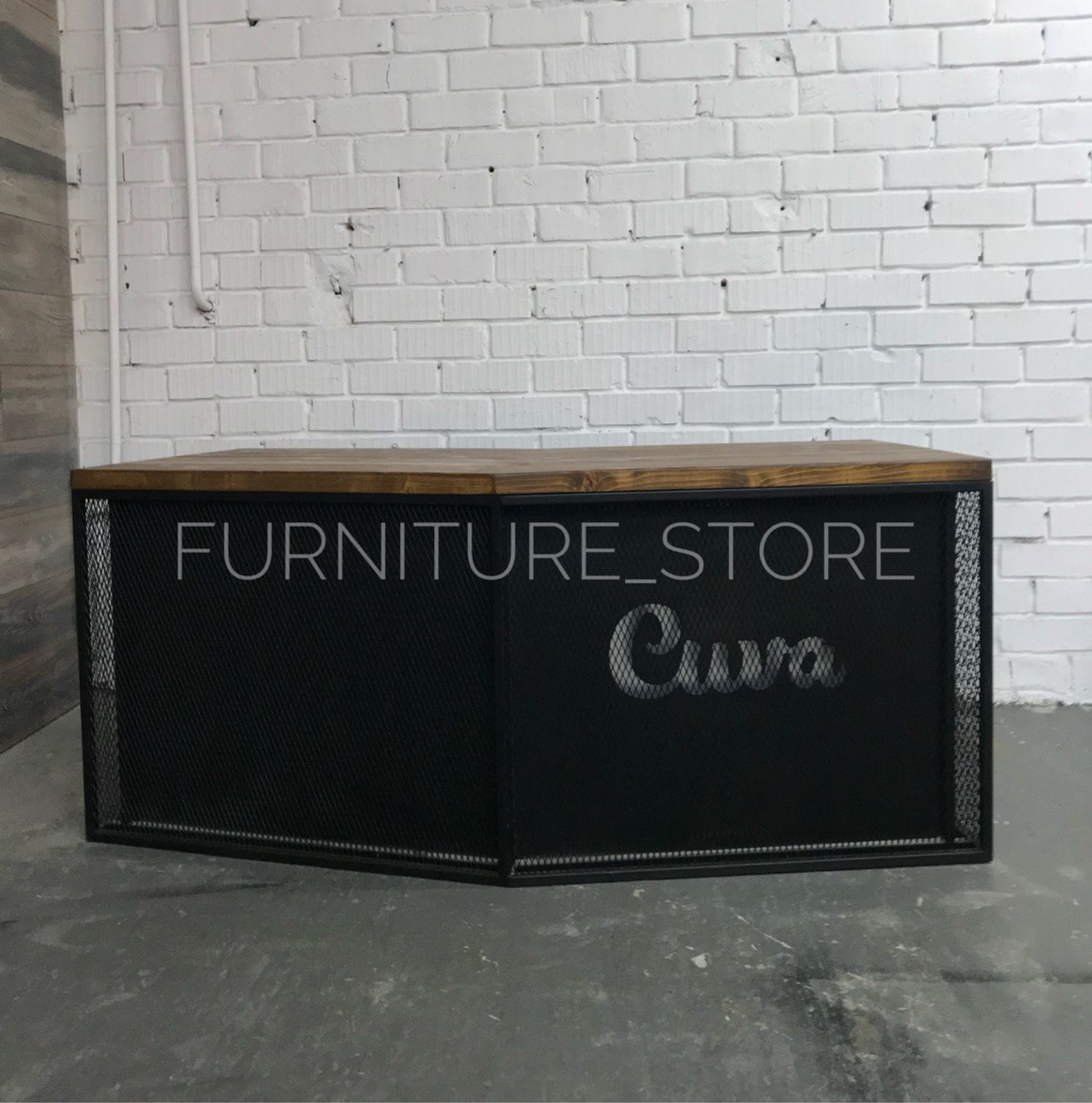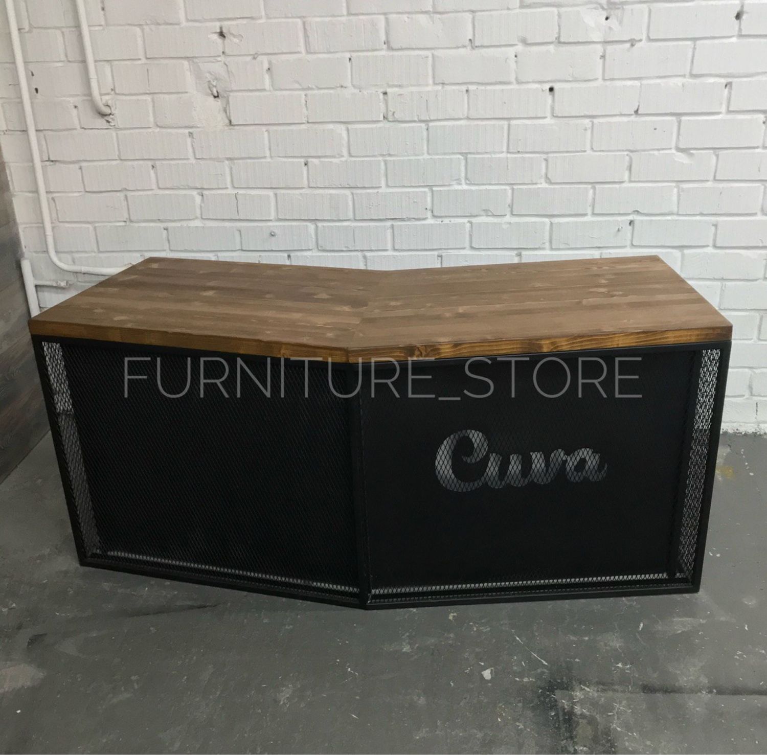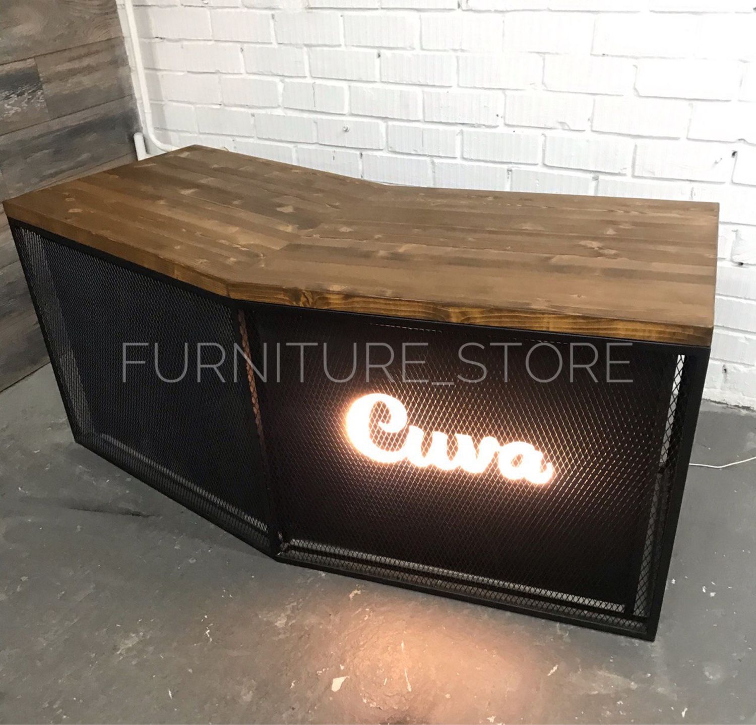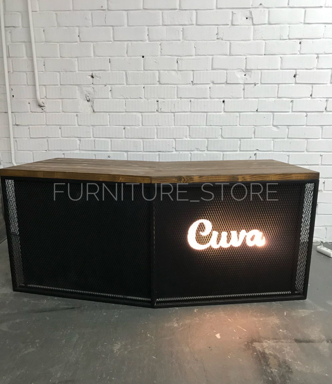 Барная стойка в стиле лофт с подсветкой и логотипом выполнена из сосны и металла. Каркас стойки изготовлен из металлического каркаса. Фасад обшит металлическим листом и металлической сеткой. Столешницы и внутренне наполнение изготовлены из сосны.