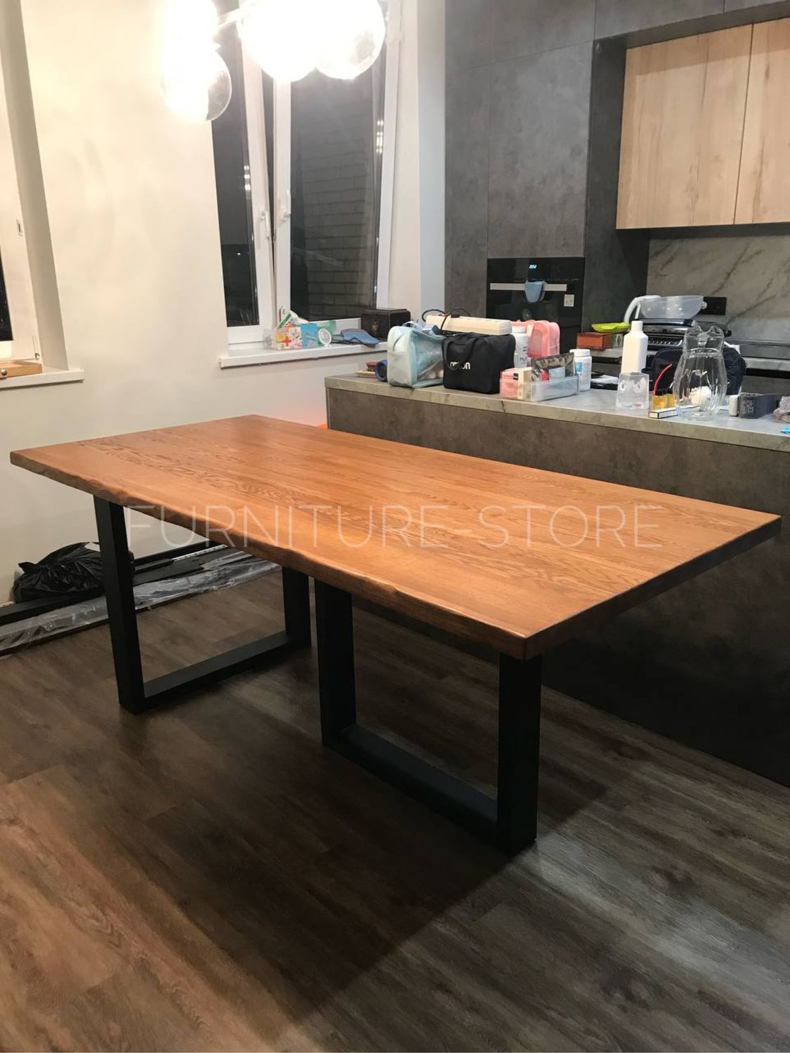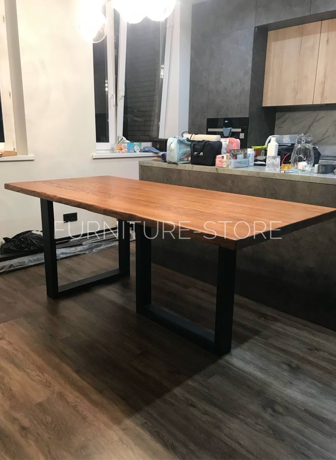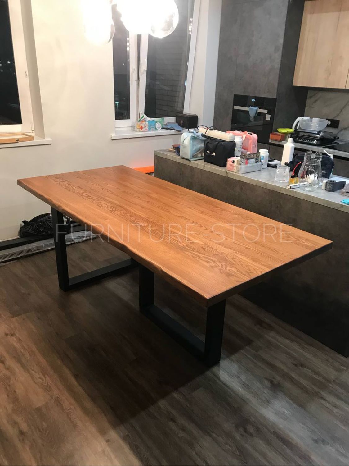 Стол в стиле лофт изготовлен из массива дуба и металлического профиля. Дубовая столешница (40 мм) изготовлена с живым краем, покрыта тонирующим маслом и матовым мебельным лаком. Металлической профиль покрыт порошковой краской по металлу.
