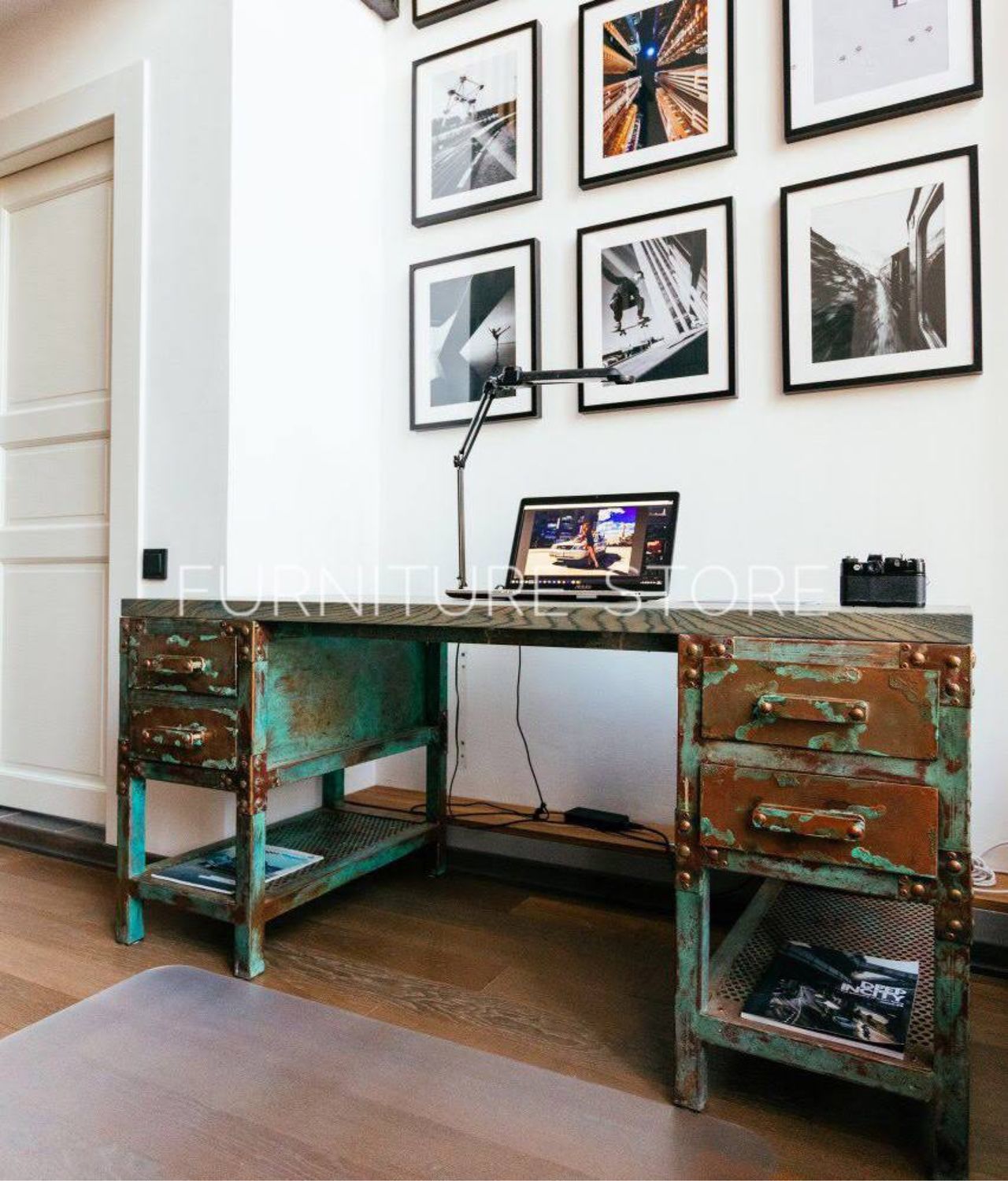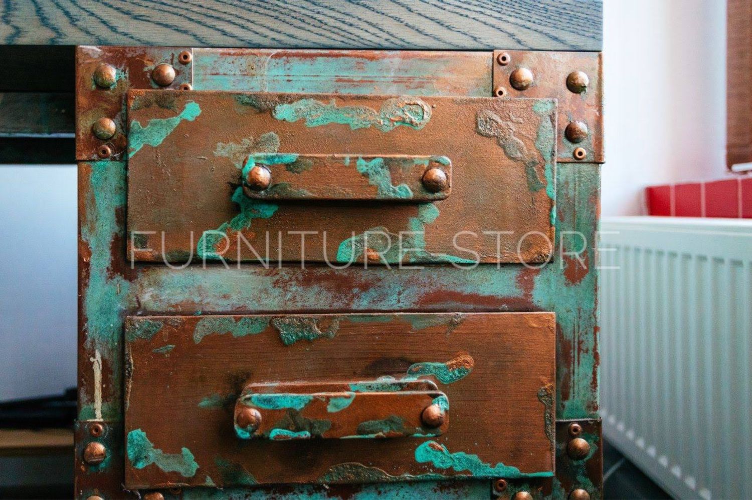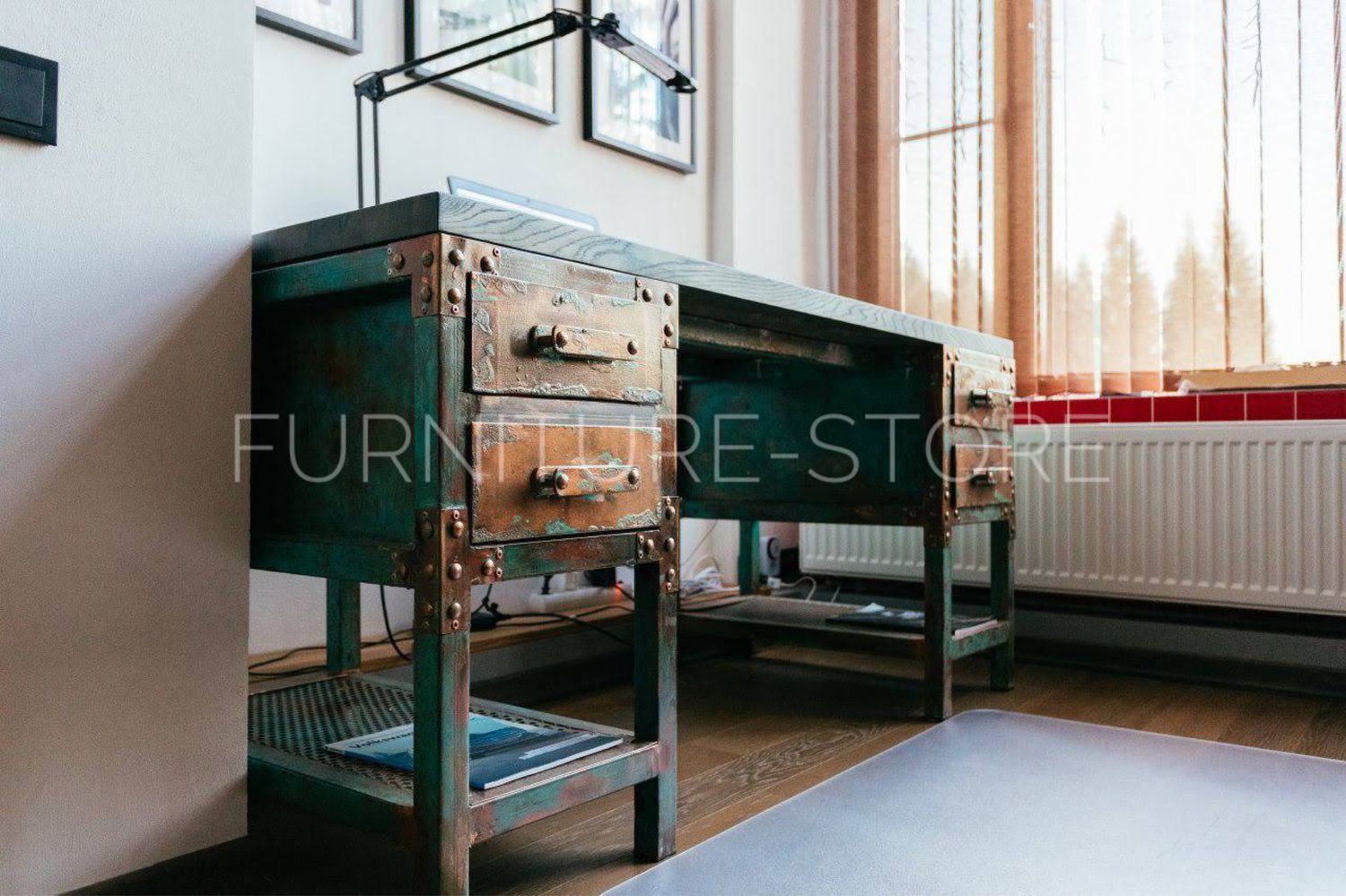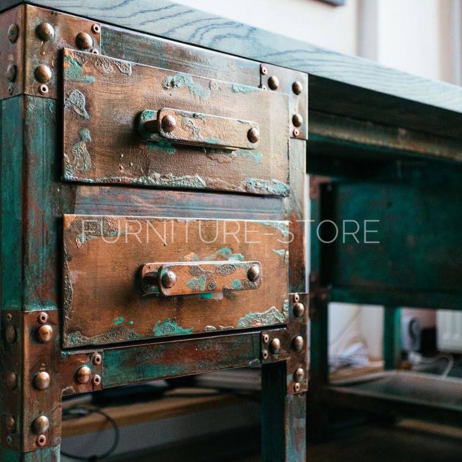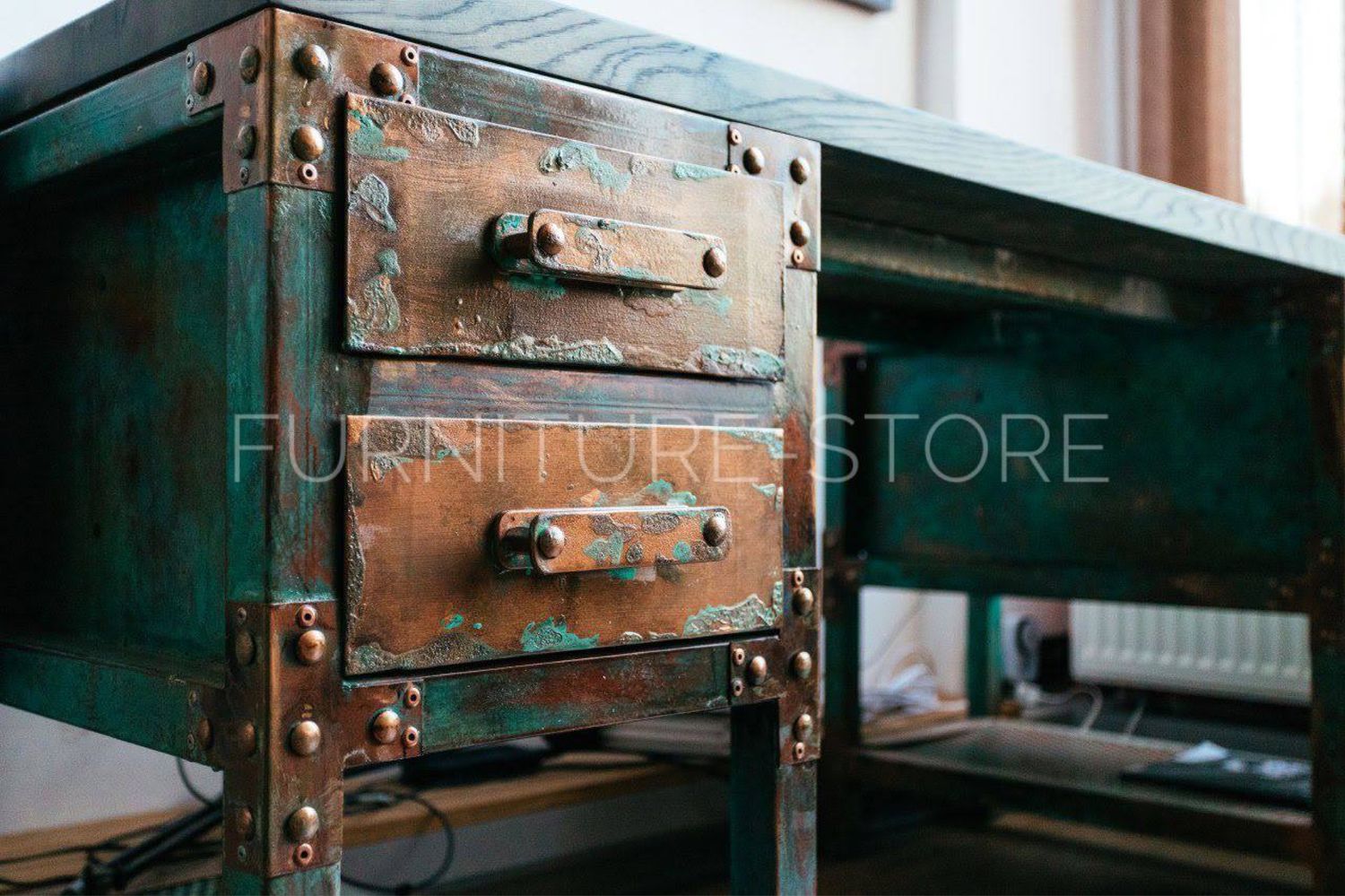Рабочий стол в индустриальном стиле изготовлен из массива дуба и металла. Каркас стола выполнен из металлического профиля, фасады выдвижных ящиков на направляющих с доводчиками, изготовлены из металлического листа и декорированы металлическими уголками с клёпками. В работе применена техника искусственного ржавления металла.